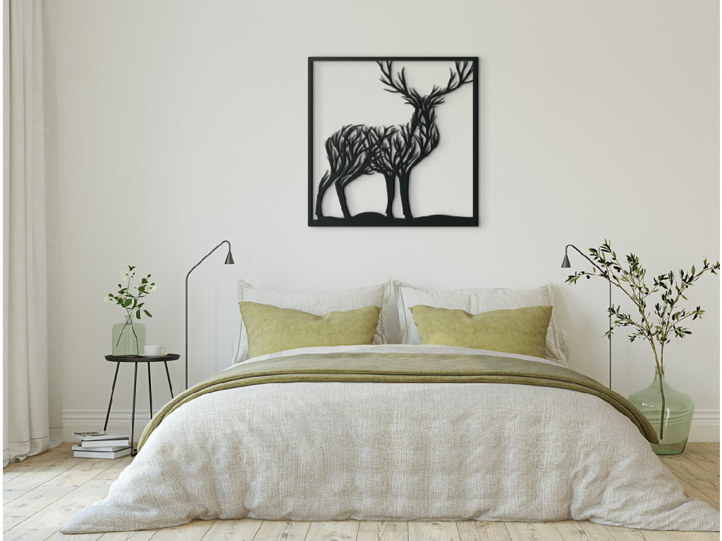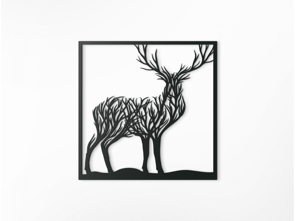 Drevený obraz Jeleň a stromy je skvelým doplnkom do moderných aj klasických interiérov. Rovnako je tiež výborným darčekom pre poľovníkov či milovníkov lesnej zveri. Znázorňuje siluetu jeleňa s nádherne rozvetvenými parohami, ktorá je sformovaná z korún a konárov stromov.