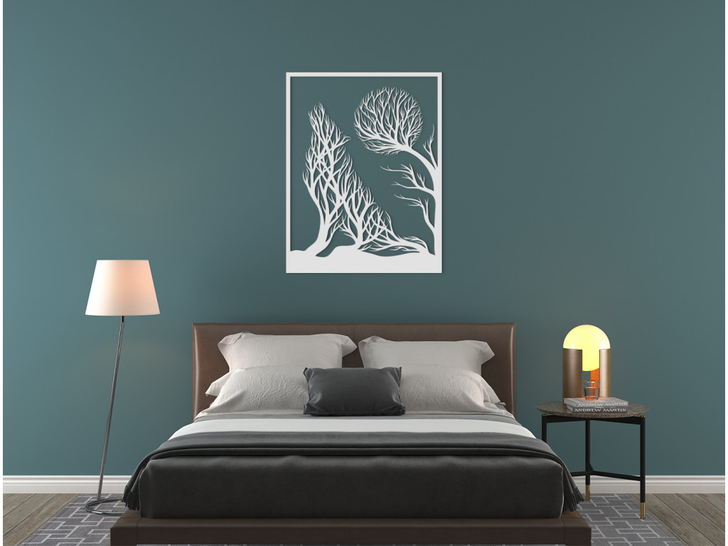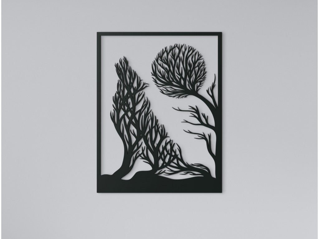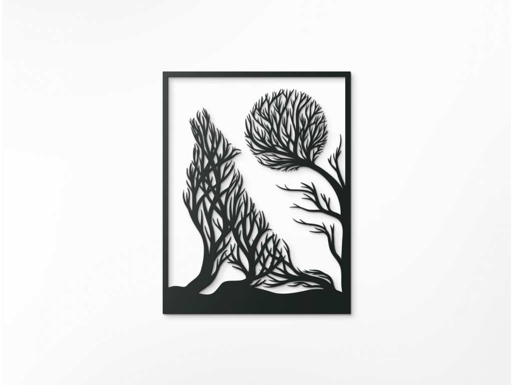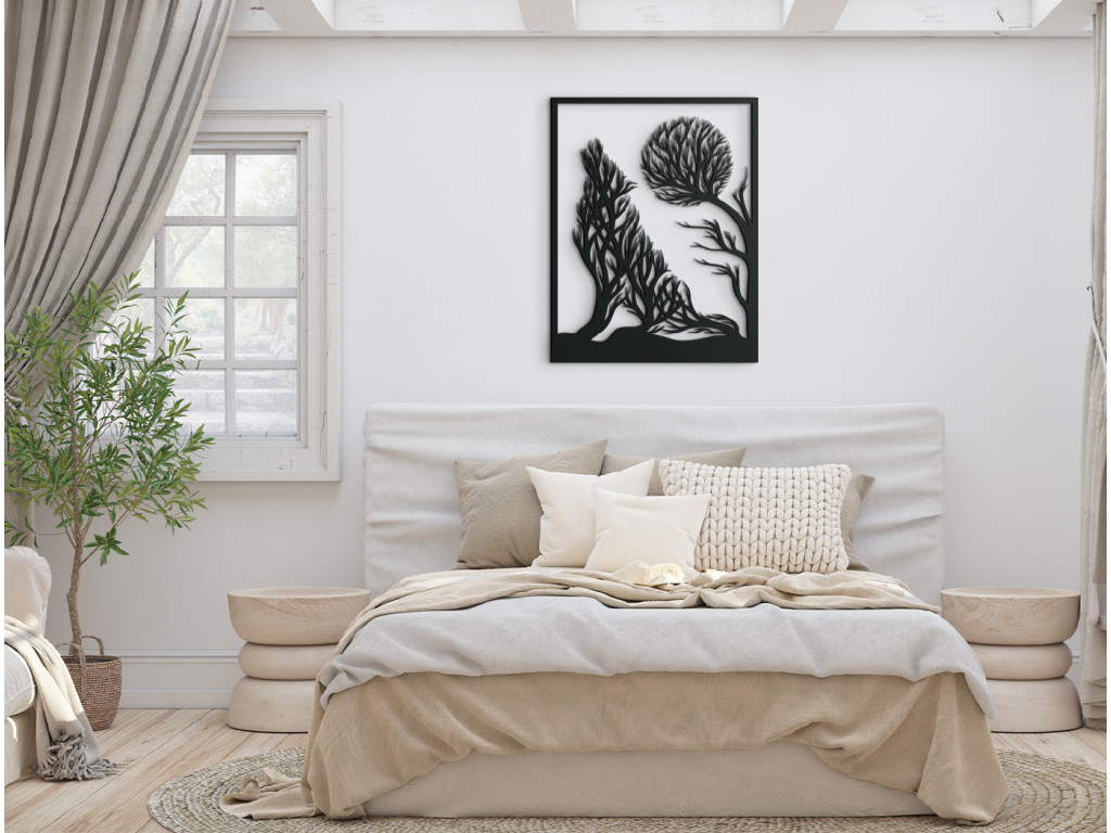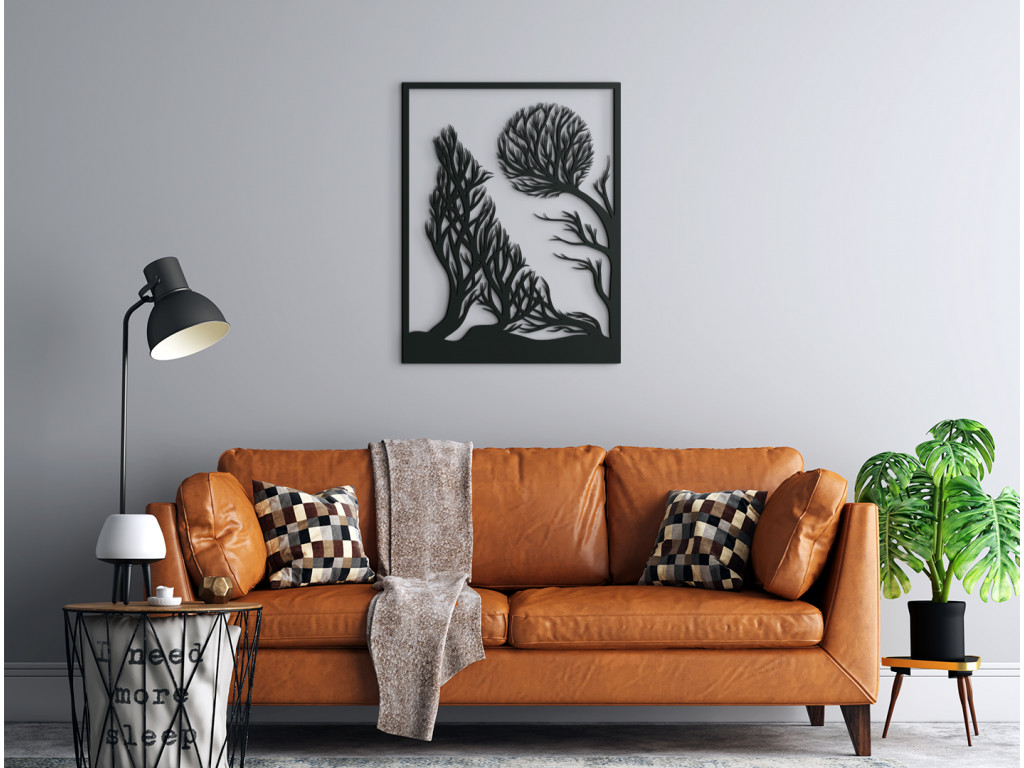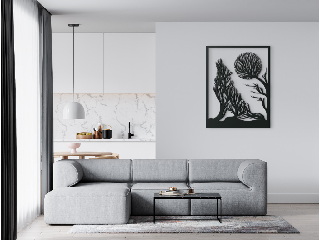 Moderne stvárnený vlk vyjúci na mesiac - to je tá pravá dekorácia do trendových interiérov. Tajuplná scenéria pritom v sebe ukrýva ešte jednu zaujímavosť. Podoba vlka aj mesiaca je na dekorácii nevšedne znázornená pomocou konárov a korún stromov.