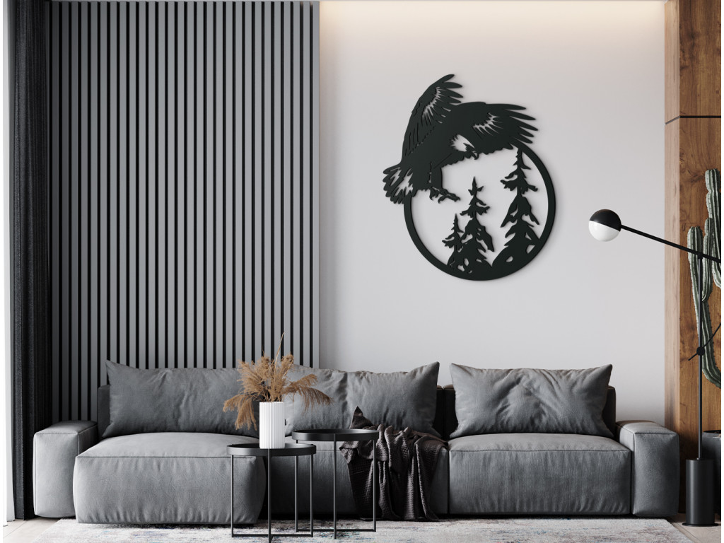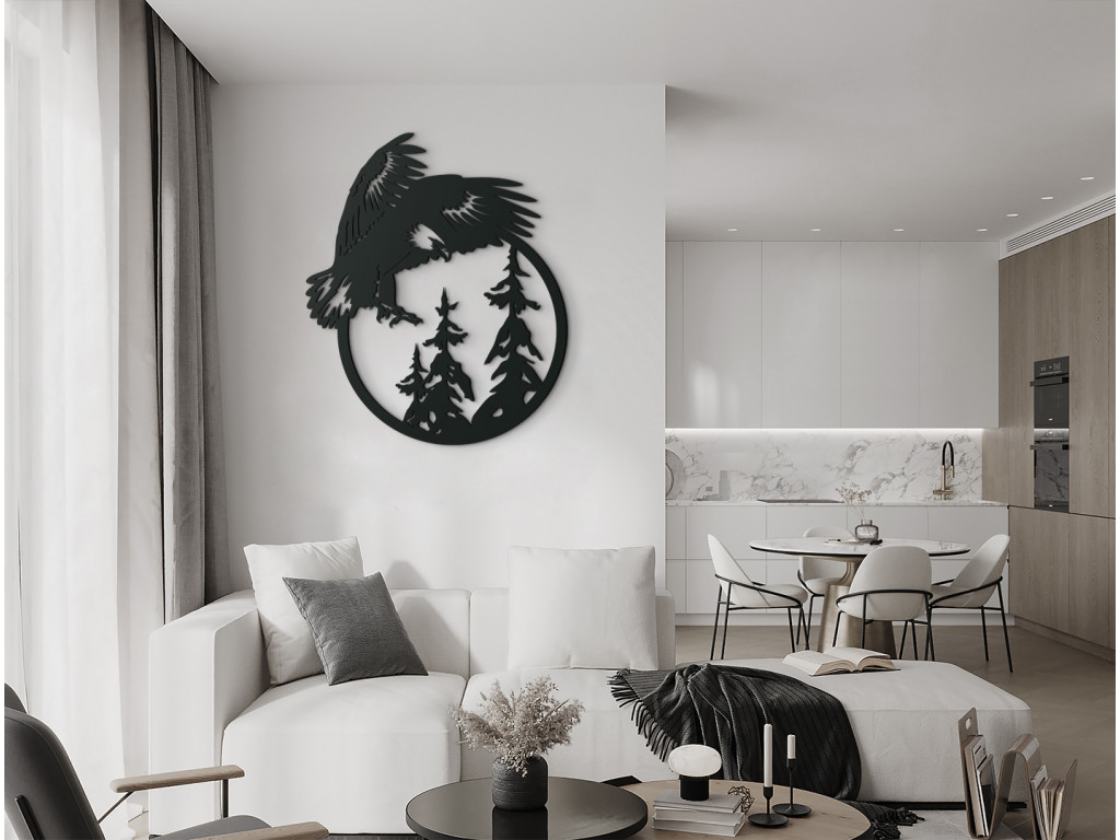 Nálepku na stenu Orol útočí si môžete nalepiť v modernom aj klasickom interiéri. Drevená dekorácia s veľkolepým kráľom vtákov dodá celej miestnosti trendový dizajn. Obraz je tiež vhodný ako darček pre milovníkov hôr, poľovníkov i turistov.