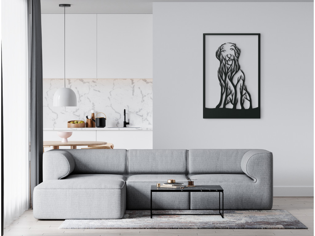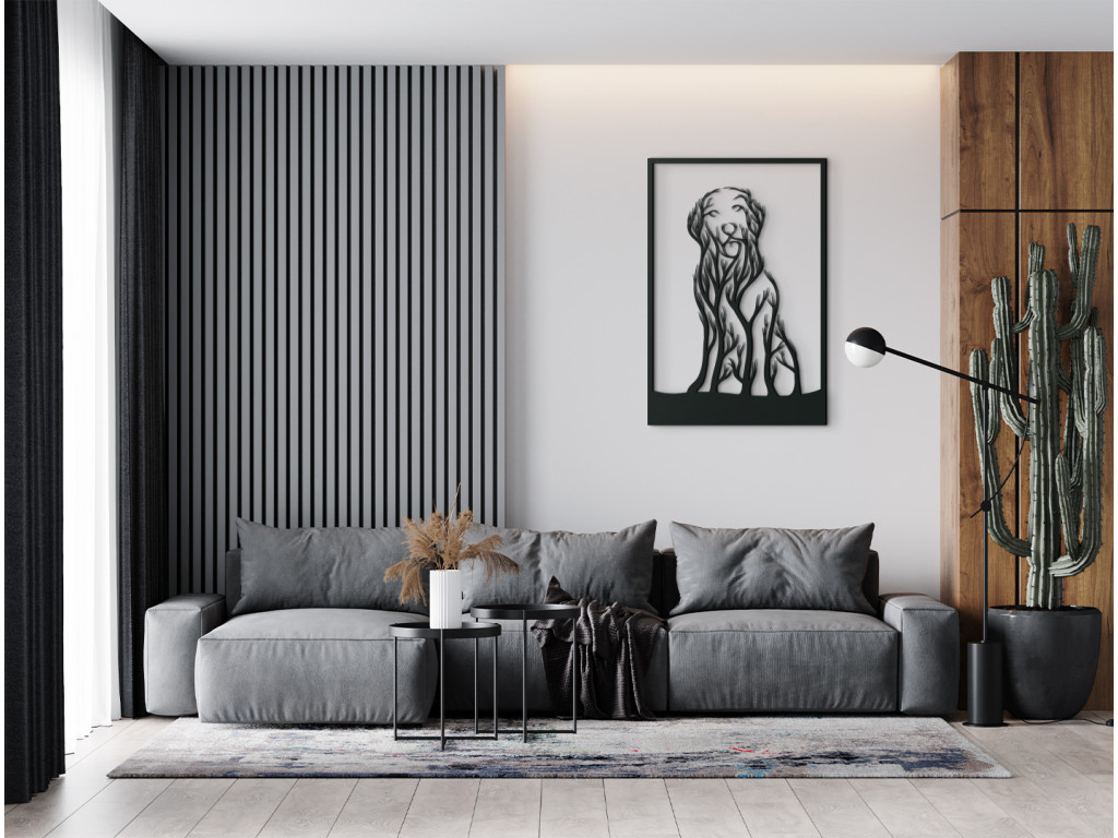 Obraz s netradične spracovaným motívom sediaceho psa je vhodný najmä do moderných interiérov. Drevená dekorácia na stenu je pre pohodlnejší výber dostupná v niekoľkých farebných variantoch.