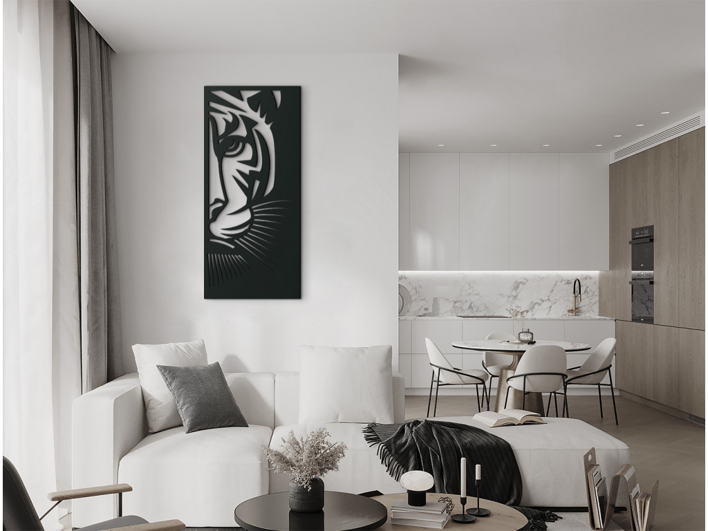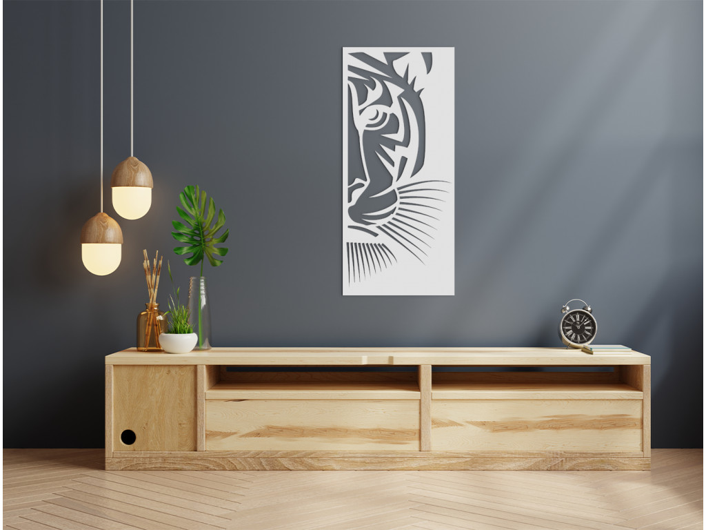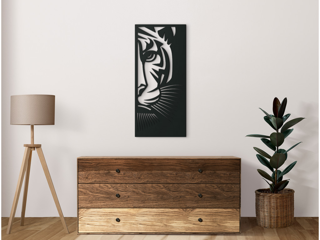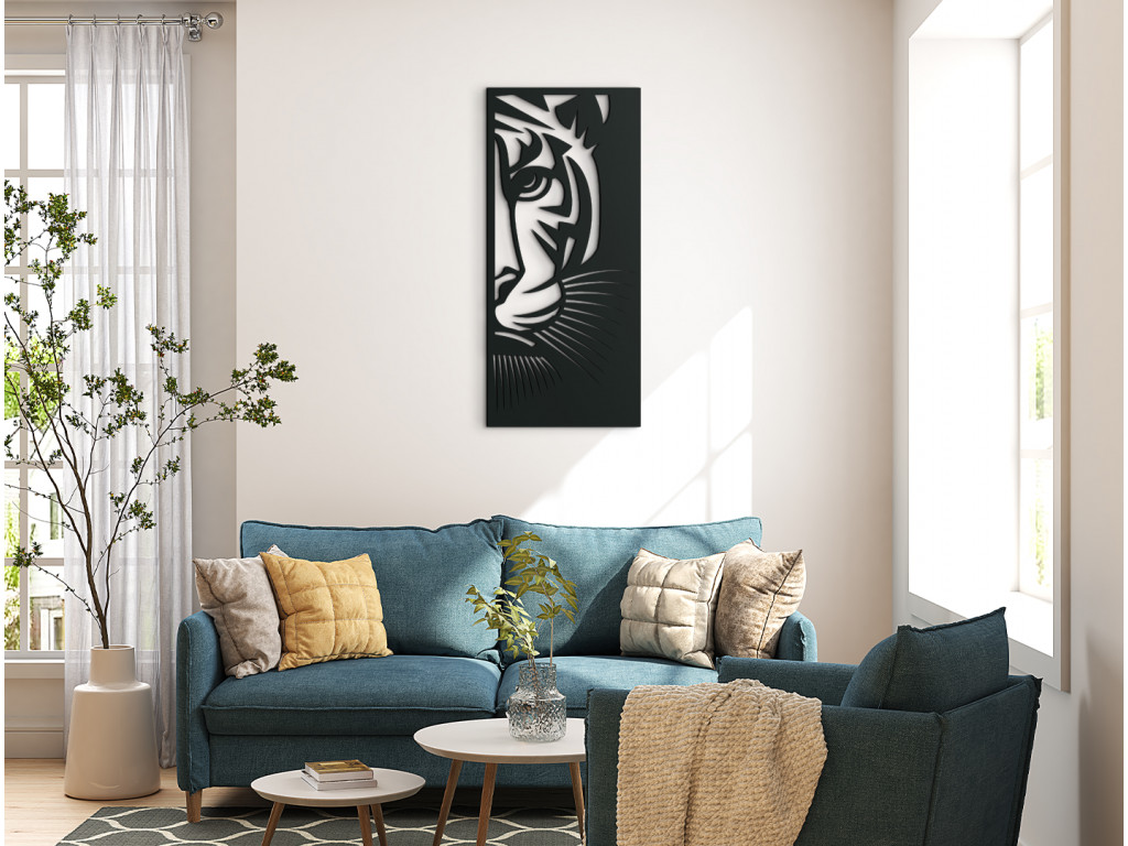 Ozdobte si obývačku, spálňu alebo jedáleň drevenou nálepkou na stenu v pôsobivom modernom dizajne. Elegantná dekorácia na stenu s majestátnou tigrou hlavou je vynikajúcim nápadom aj na darček pre priateľov či známych.