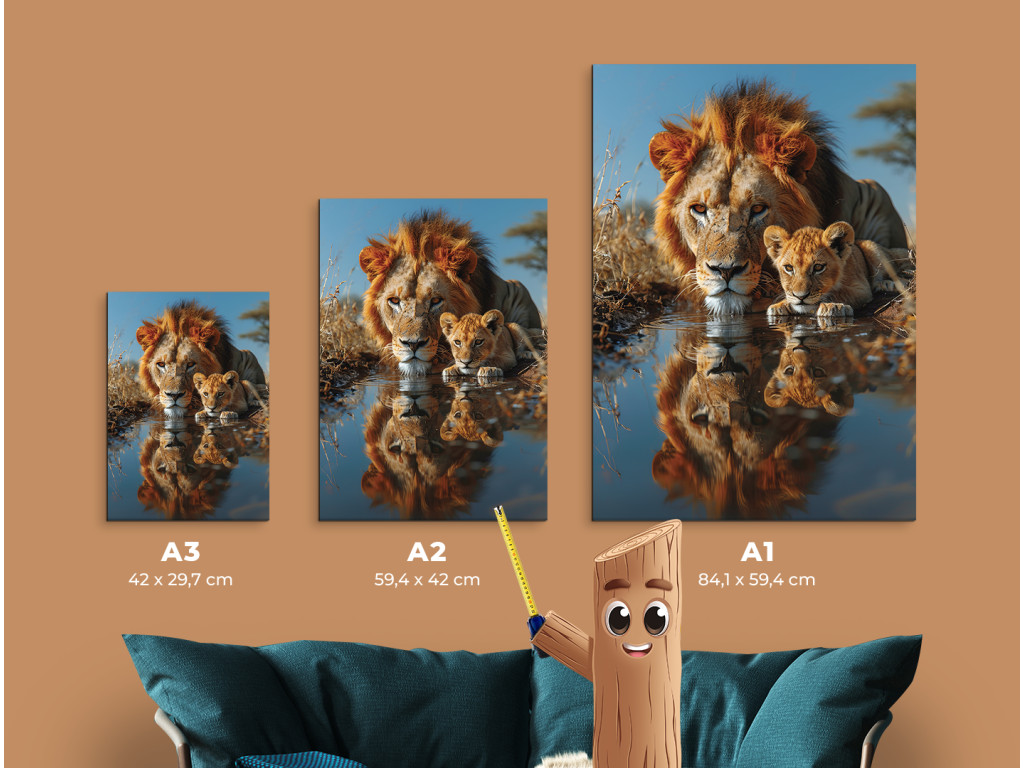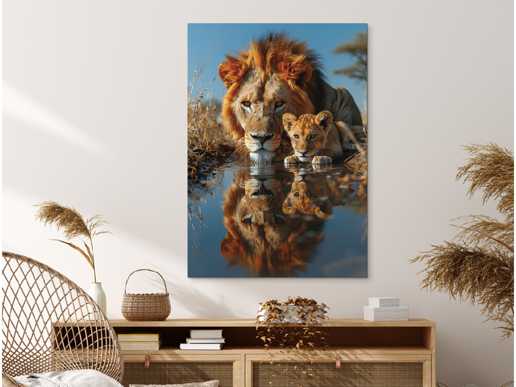 Obraz Levy v odraze zachytáva dojímavý moment, v ktorom dospelý lev a levíča spoločne pijú vodu z tichej kaluže uprostred savany. Ich siluety sa zrkadlia na hladine, čím vzniká obraz plný pokoja, spojenia a prirodzenej krásy. Scéna pôsobí autenticky a nežne – ako tichý rituál života v divočine, kde sila a nevinnosť existujú bok po boku. Obraz je vizuálnym vyjadrením dôvery, ochrany a pokračovania rodu.