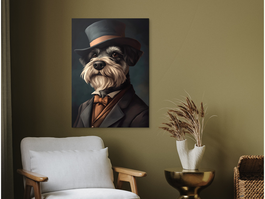 Bradáč aristokrat je jedinečný portrét zachytávajúci charizmatického bradáča v obleku s cylindrom a motýlikom. Jeho typická fúzatá tvár a dôstojný výraz dokonale ladia s elegantným odevom, čím vzniká obraz plný noblesy a jemného humoru. Vhodný pre milovníkov psov, najmä plemena bradáč, alebo ako štýlový a originálny doplnok do moderného interiéru s nadhľadom.