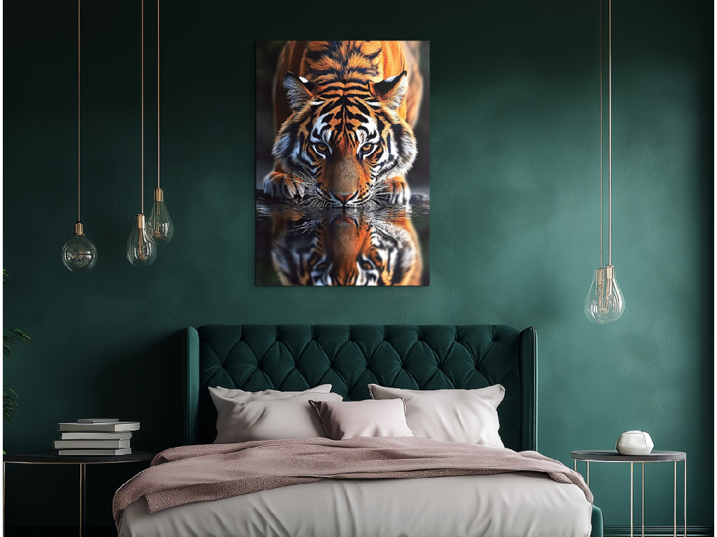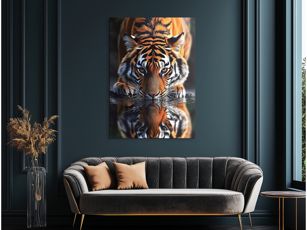 Smädný tiger je obraz, ktorý zachytáva intímny a zároveň silný moment – majestátny tiger sa skláňa k hladine vody, aby sa napil. Jeho pohyb je sústredený, tichý a plný rešpektu k prírode. Detailné spracovanie srsti, odraz na vodnej hladine a intenzita farieb vytvárajú vizuálnu rovnováhu medzi dravosťou a pokojom. Obraz pôsobí ako zastavený okamih z divočiny – silný a pôsobivý zároveň.