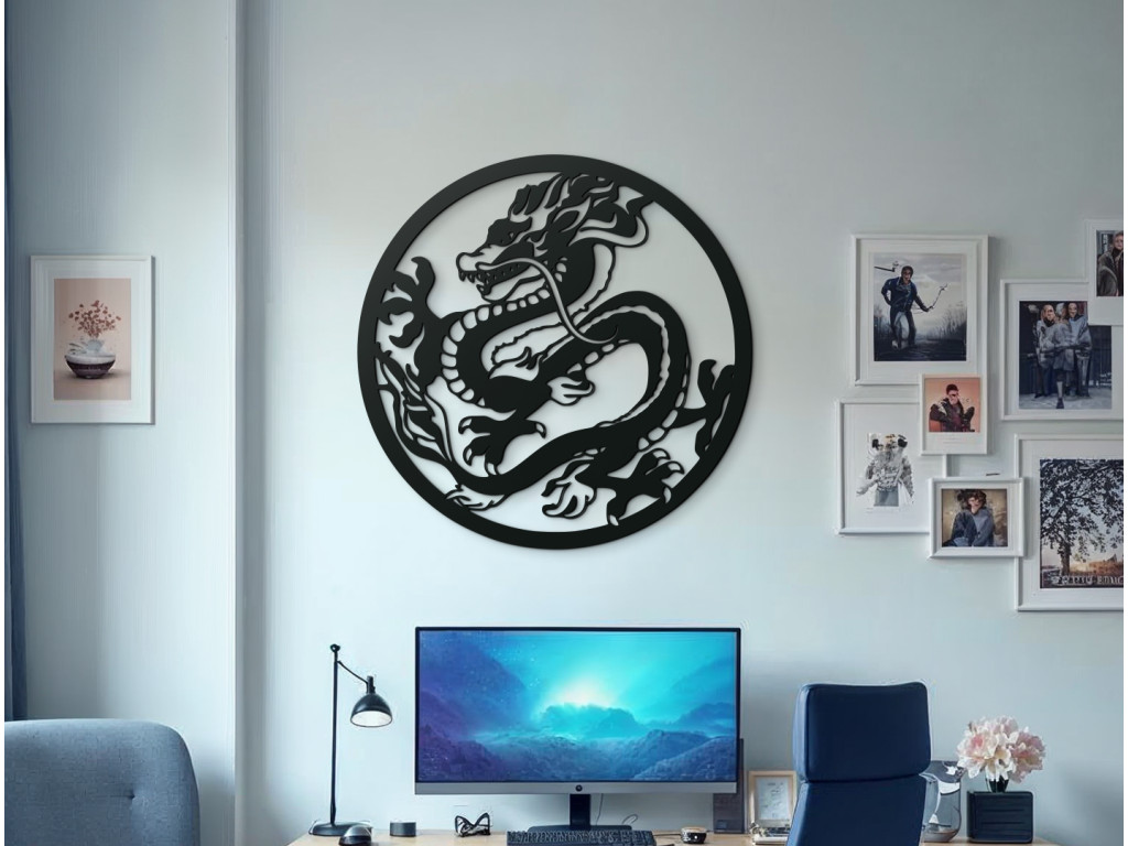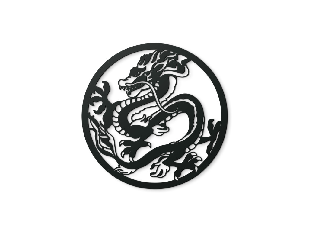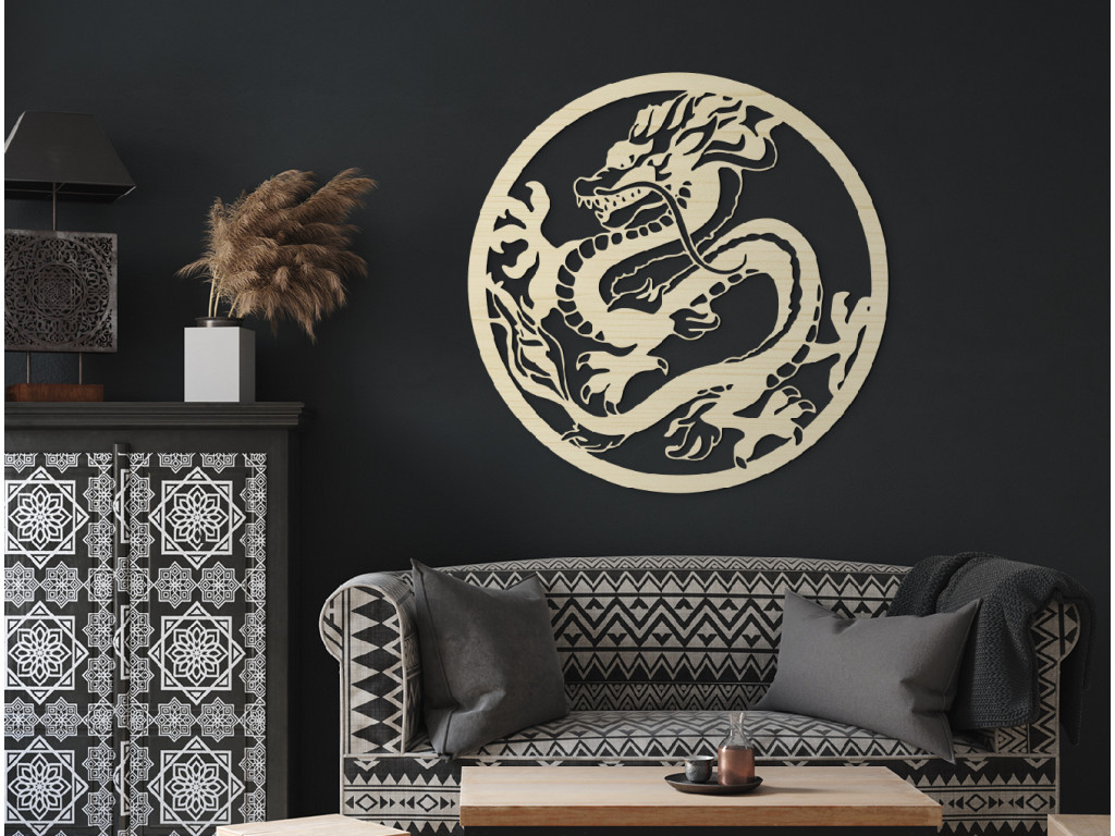 Okrúhla drevená nálepka Drak predstavuje elegantného čínskeho draka so svižnými krivkami a bohatými detailmi. Jeho tradičný dizajn a výrazné tvary dodávajú interiéru autentický orientálny nádych. Ideálna pre tých, ktorí chcú svojmu priestoru pridať kúsok kultúrnej elegancie a mystiky.