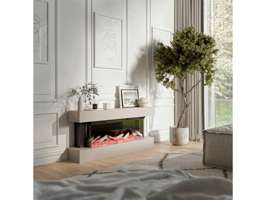 Moderný krb Kioto v matnej kašmírovo béžovej farbe prináša luxusný vzhľad aj teplo domova. Realistický efekt ohňa, 7 farebných režimov, tichý chod a inteligentné ovládanie robia z tohto krbu ideálny doplnok do každej modernej obývačky.