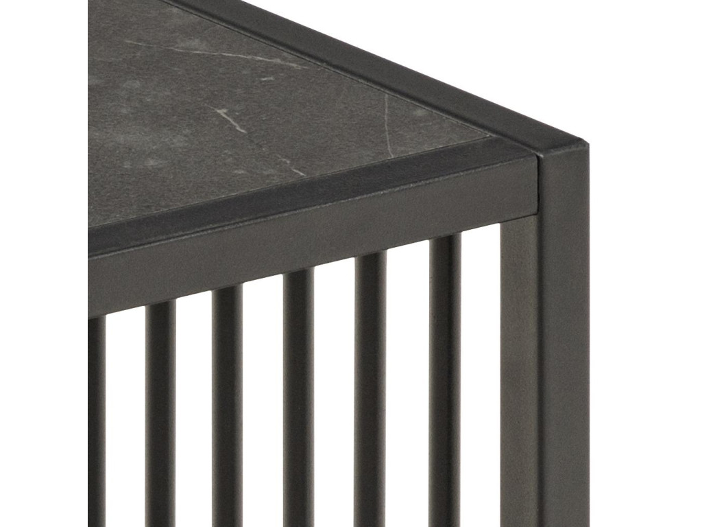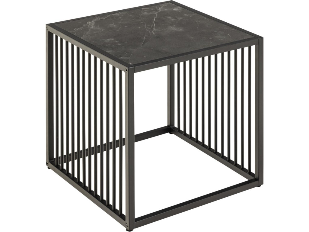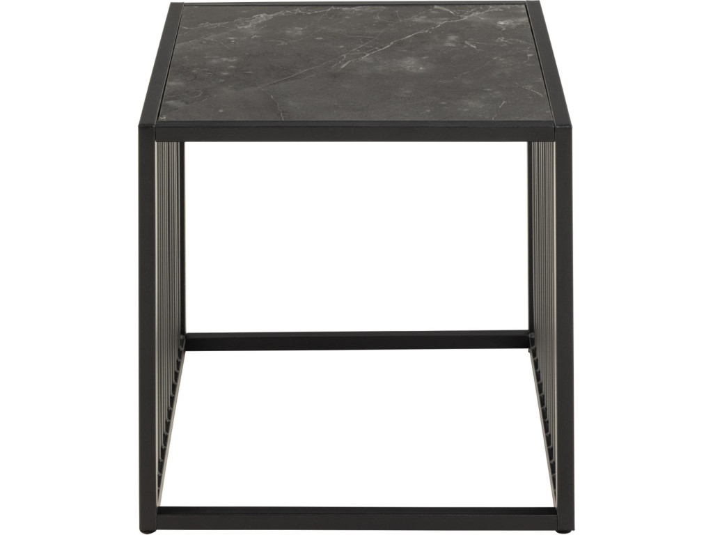 Odkladací stolík Strington B ponúka kompaktný formát a výrazný štýl v jednom. Vďaka štvorcovej doske s čiernym mramorovým vzhľadom (matná čierna Izmir) a bočným lamelám z ocele prináša do interiéru vizuálnu štruktúru a architektonickú eleganciu. Čierna drôtená základňa z ocele s hrubým práškovým nástrekom zabezpečuje stabilitu a zároveň dotvára typický charakter kolekcie. Tento stolík je ideálny ako doplnok k pohovke, posteli alebo do vstupného priestoru – s miestom na dekorácie, sviečky alebo každodenné drobnosti.