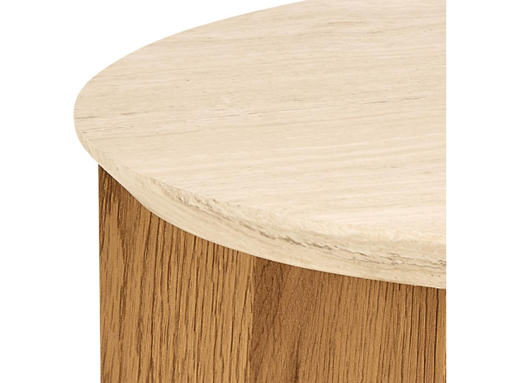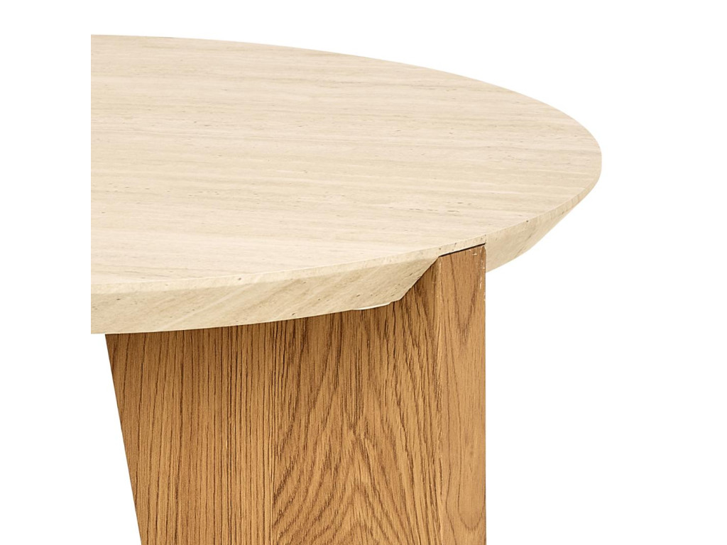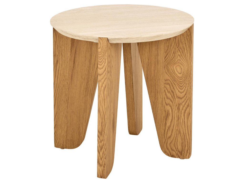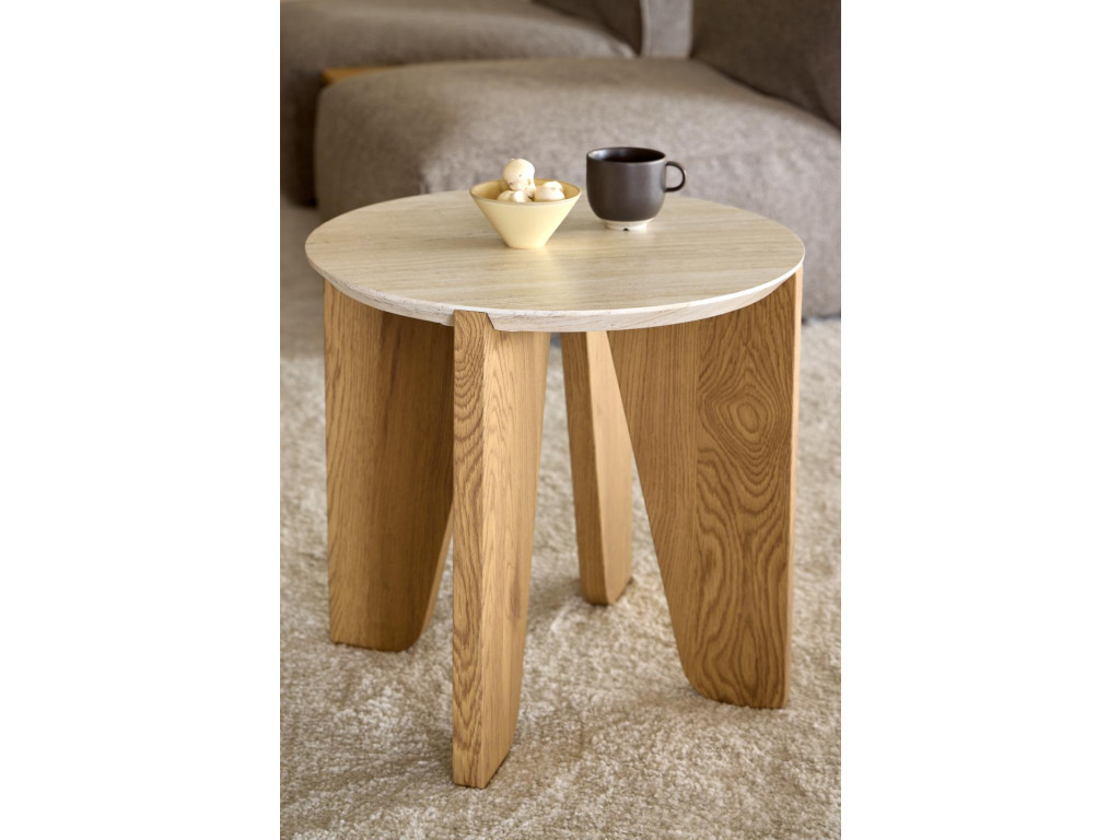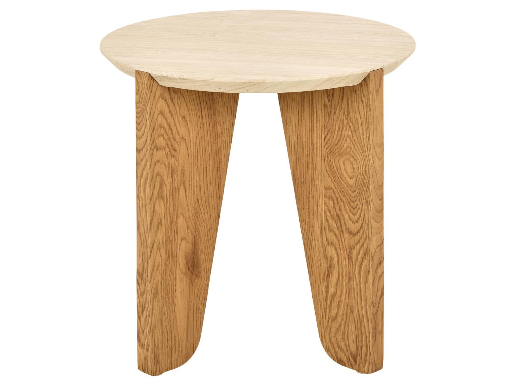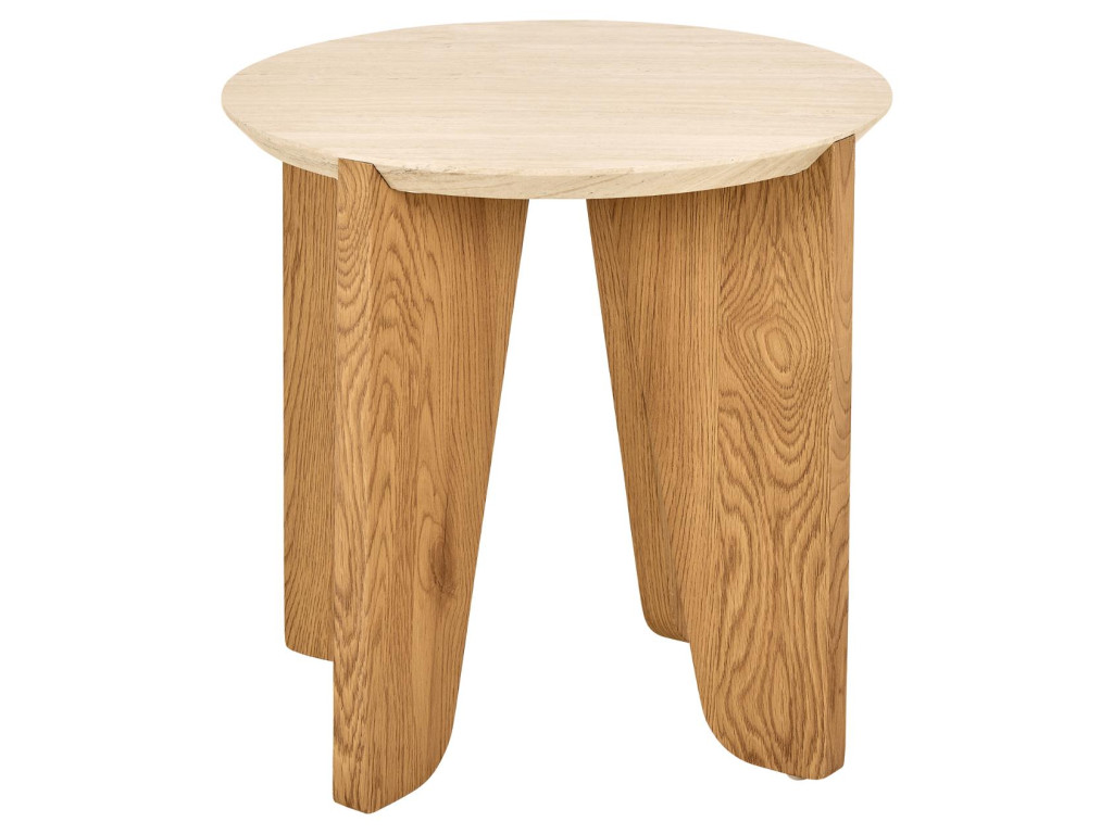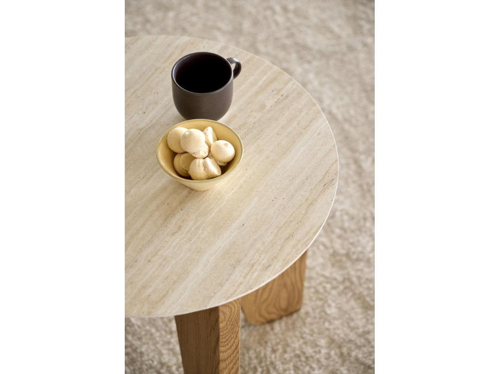 Okrúhly príručný stolík Dockland, Ø50x50 cm, v sebe spája vzhľad béžového travertínu s matným divokým dubom, čím vytvára vyvážený kontrast medzi prírodným šarmom a modernou jednoduchosťou. Organický dizajn so zaoblenými hranami, spolu s brúsenými nožičkami v dubovom dekore, dodáva stolíku jemnosť a eleganciu. Je ideálnym riešením do moderných domácností, kde zastane praktickú aj estetickú funkciu – či už vedľa pohovky, postele alebo ako doplnok v predsieni.