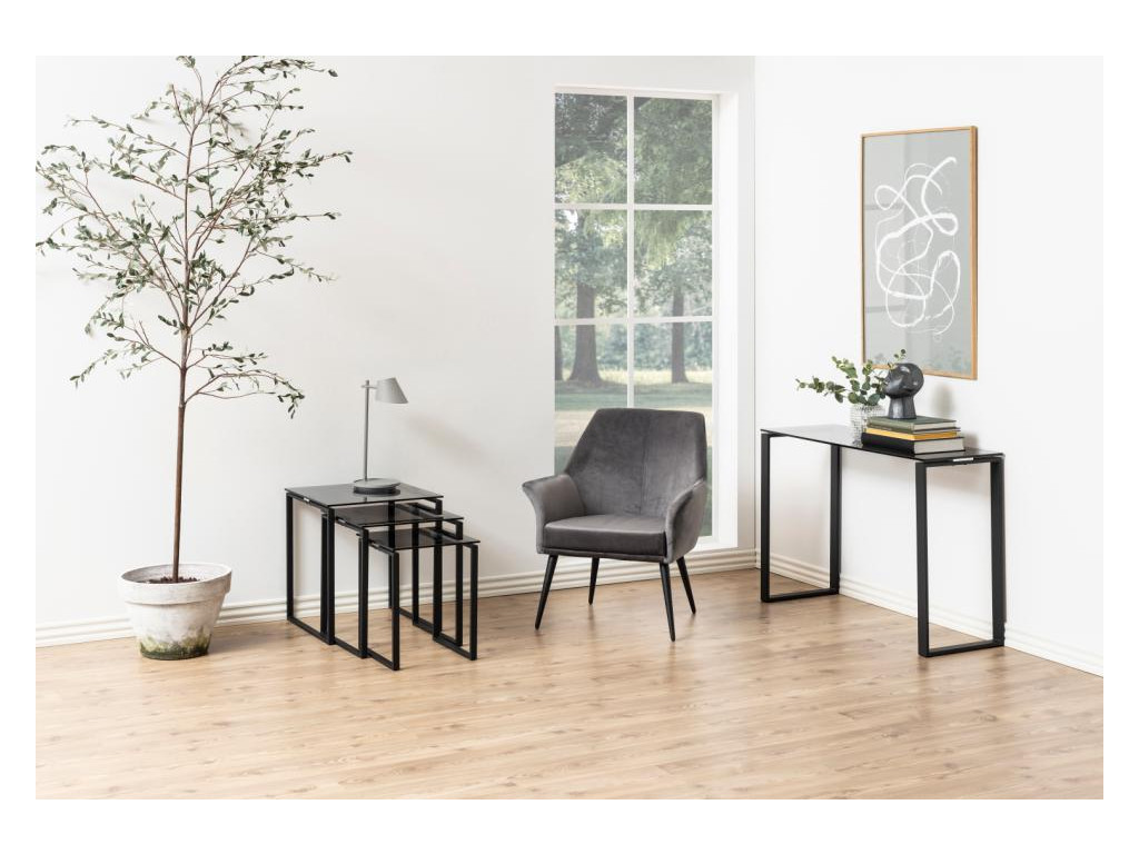 Trojica stolíkov Katrine s dymovým sklom a čiernou oceľovou podnožou dodá vášmu interiéru moderný, sofistikovaný výraz. Ich tmavý tón pôsobí elegantne, no zároveň neutrálne, takže sa skvele kombinujú s ďalším nábytkom.