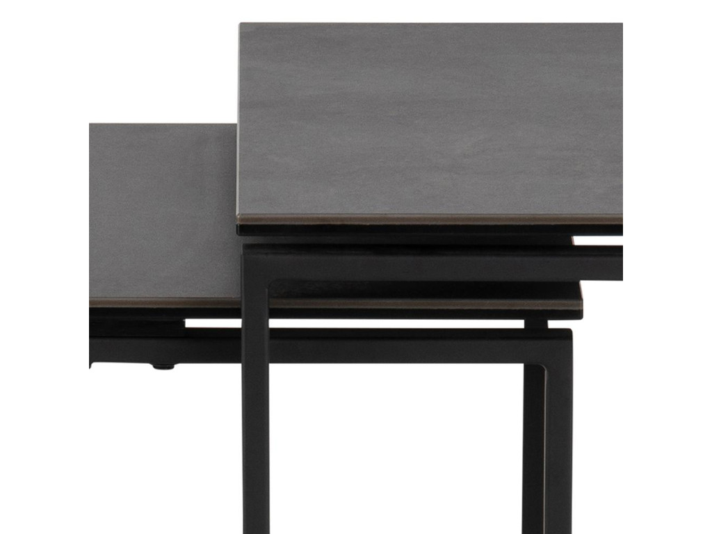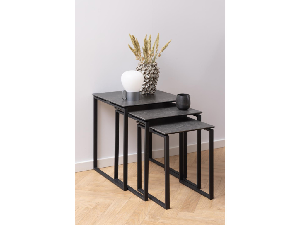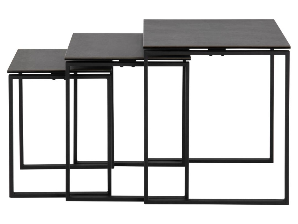 Stolíky Katrine ponúkajú súpravu troch praktických kúskov v hranatom tvare. Povrch z hrubej čiernej keramiky a stabilné oceľové podstavce zabezpečujú stabilitu aj štýl. Hniezdový dizajn umožňuje šetrenie miesta a flexibilné usporiadanie.