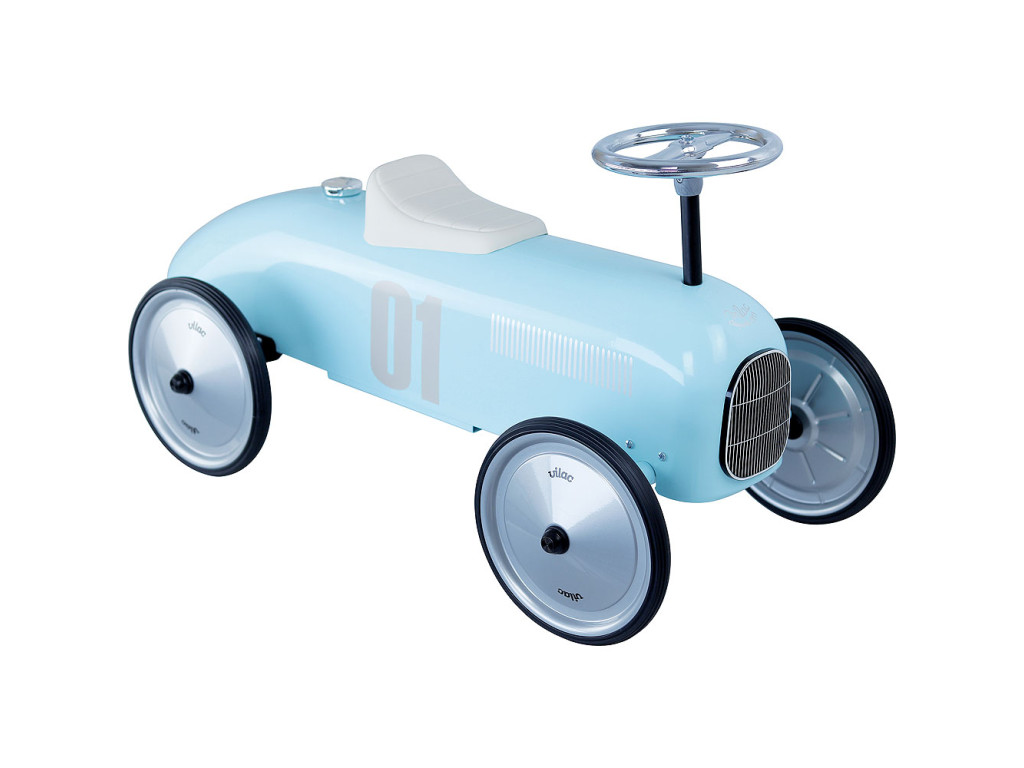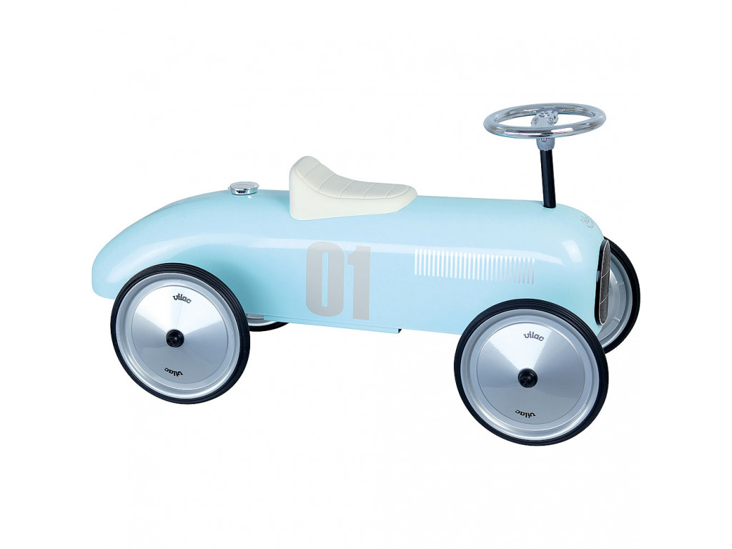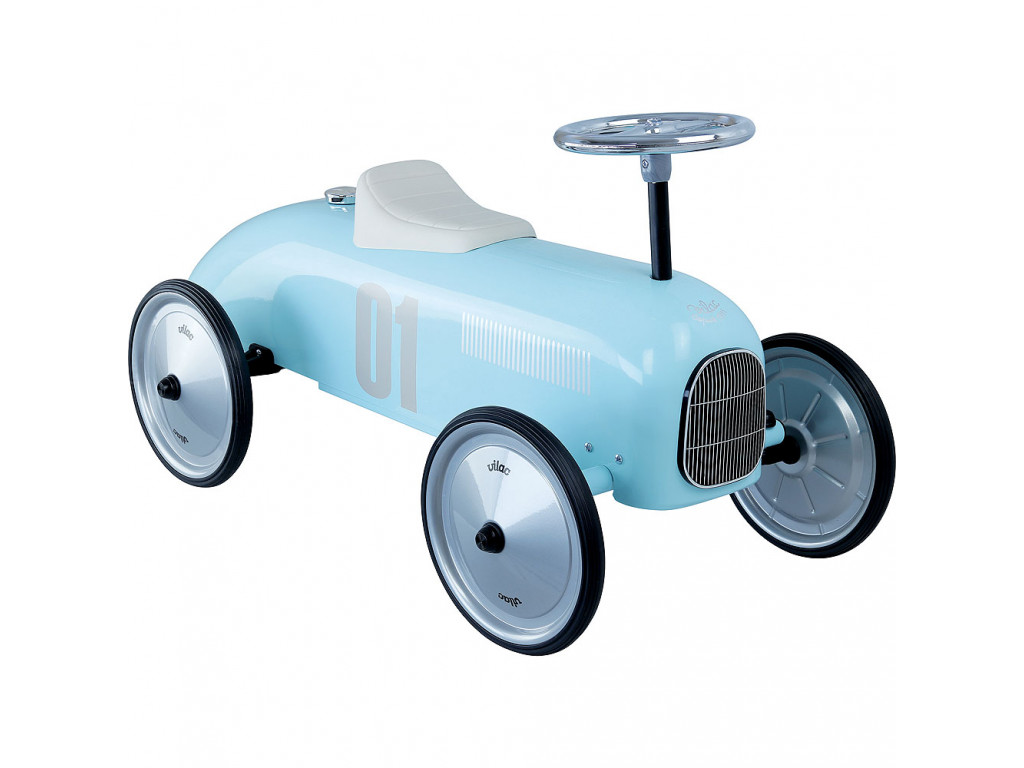 Odrážadlo Vintage v štýle pretekárskeho auta je plne kovové a má svetlo modrú farbu. Volant ovláda zatáčanie predných kolies. Biele sedadlo je vyrobené z plastu. Kolesá odrážadlá sú pogumovaná a zaručujú tak tichý chod aj na pevnom povrchu. Výška sesadla je 28 cm. Po vybalení je nutné zložiť. Vhodné od 18 mesiacov.