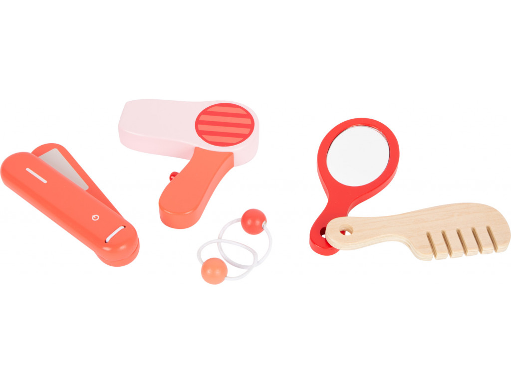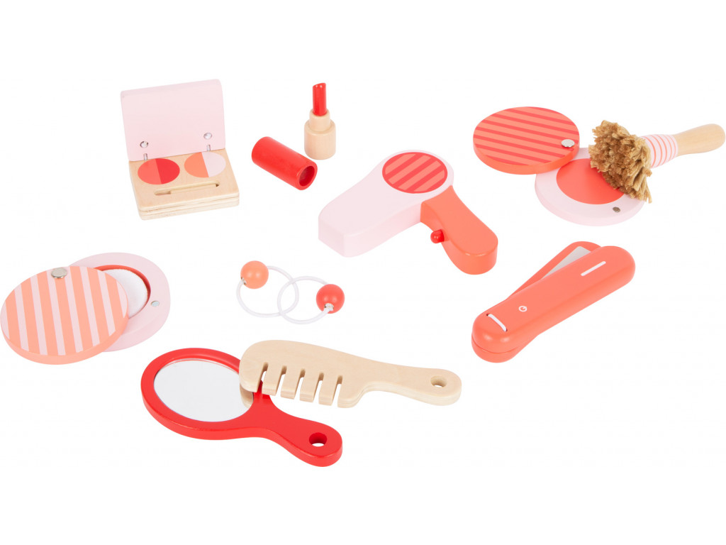 Make-up umelci a umelkyne, toto je pre vás! Kozmetický kufrík vyrobený z dreva je perfektný na hranie na role. Obsiahla sada sa skladá z hrebeňa, zrkadla, fénu, rúžu, púdru, očných tieňov, žehličky na vlasy a tiež gumičiek. Konečne sa môžete namaľovať ako mamička! Kufrík má zámok, všetky doplnky sa doň zmestia pohodlne. Kto si nechá upraviť vlasy ako prvý?