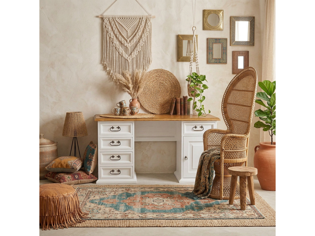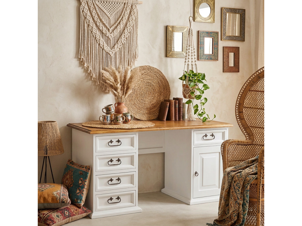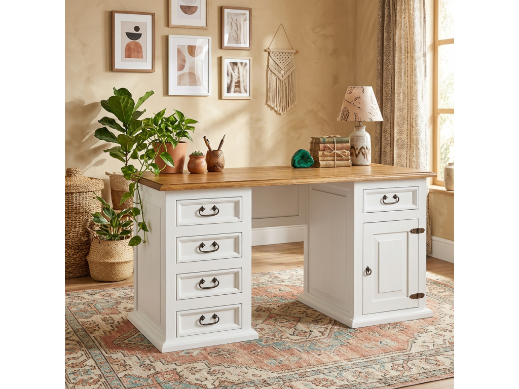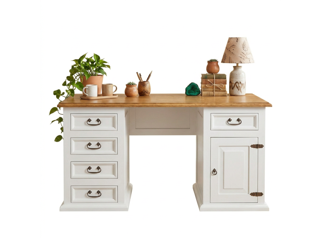 Na pravej strane má zásuvku a jednu skrinku, ktorá je vnútri rozdelená policou. Na ľavej strane stolíka sú 4 zásuvky na udržanie poriadku v dokumentoch a osobných veciach. Pánty a rúčky sú ručne kované zo železa a dokonale zdôraznia jednoduchosť a rustikálny štýl nábytku.