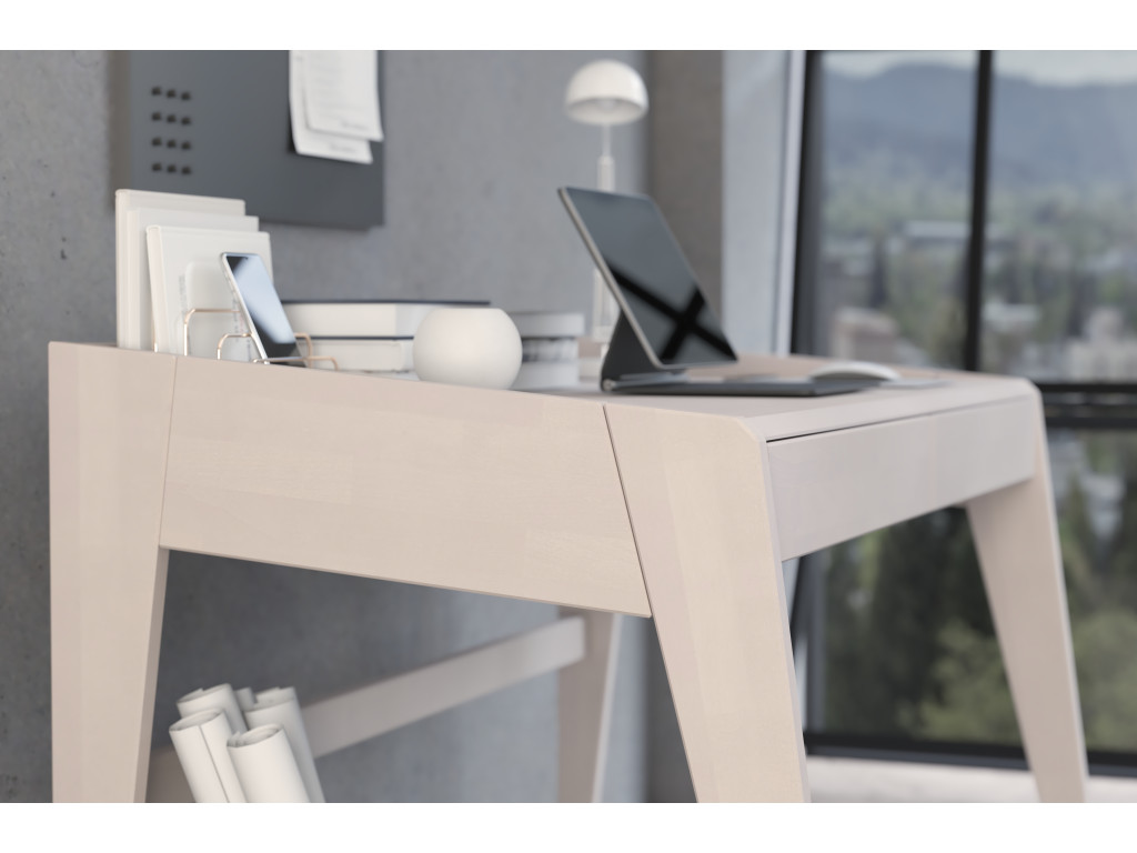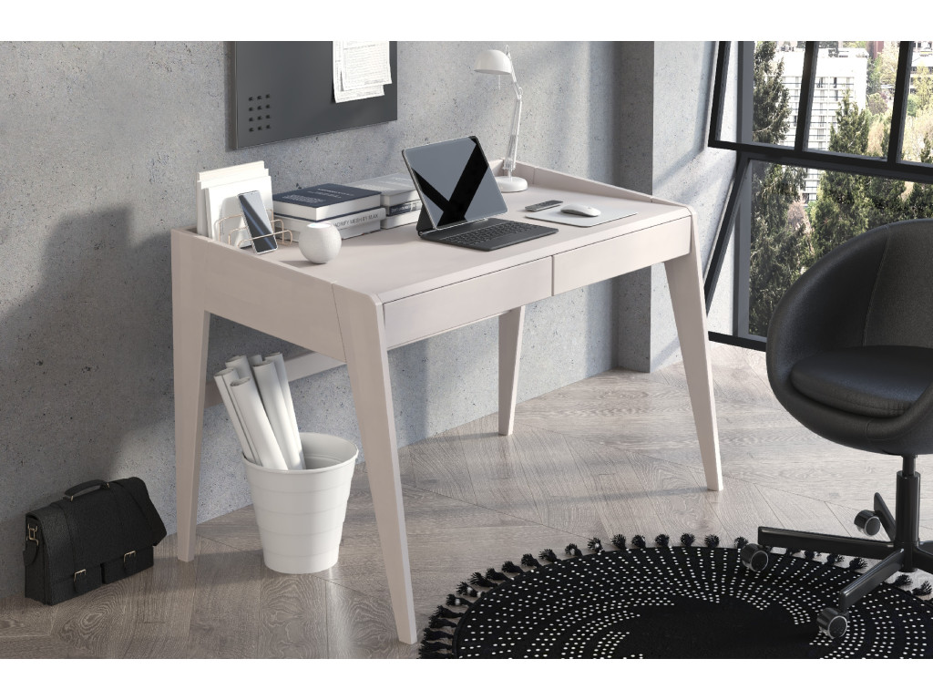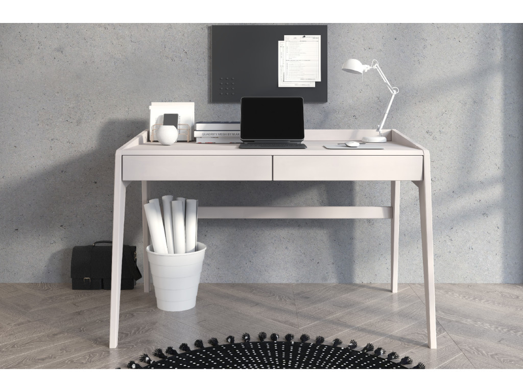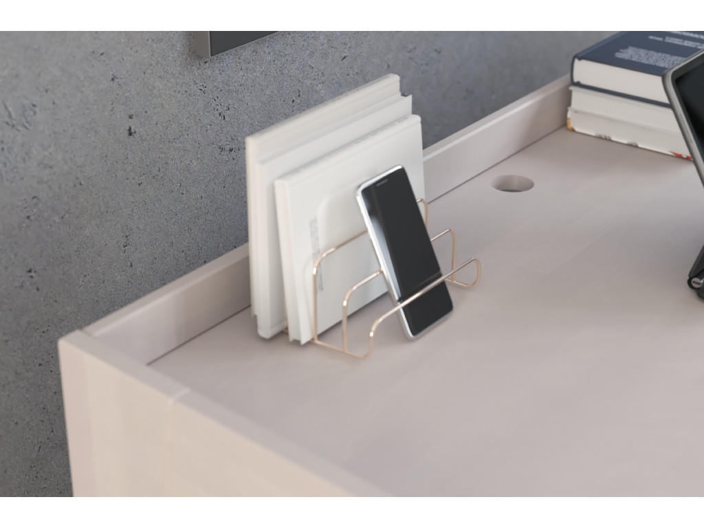 Priestranná pracovná doska ponúka optimálny priestor pre prácu alebo kreativitu, doplnená je o praktický okrúhly otvor na usmernenie káblov. Dve zásuvky poskytujú úložný priestor pre drobnosti a zvýšené okraje stola chránia pred náhodným pádom predmetov.