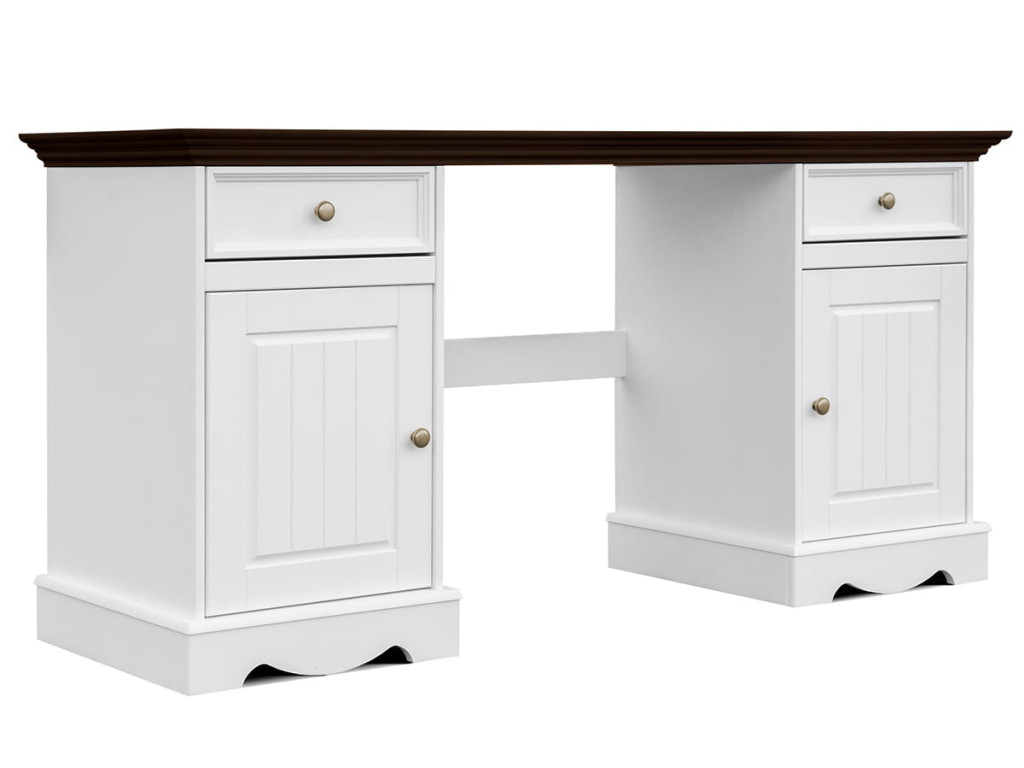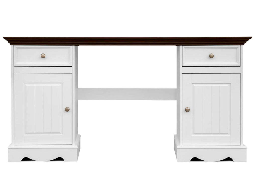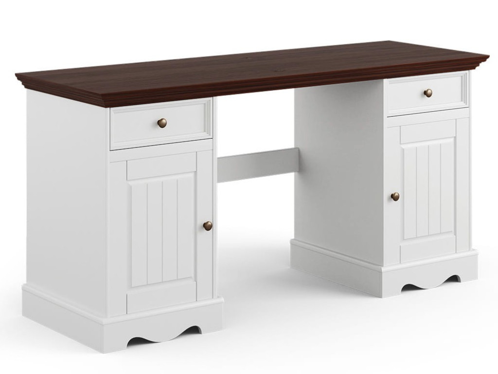 Starostlivo vybrané borovicové drevo bolo pokryté lazúrou na báze vody a bielou farbou na vodnej báze. Toto riešenie vám umožňuje vidieť nádhernú kresbu drevených krúžkov na povrchu nábytku. Krúžky v dreve dodávajú každému nábytku atmosféru, rovnako ako miestnosť, v ktorej sa tento kus nábytku nachádza. Vnútro stola je potiahnuté jednou vrstvou farby, pričom bočné strany zásuviek nie sú natreté. Pracovná doska je vo farbe orech.