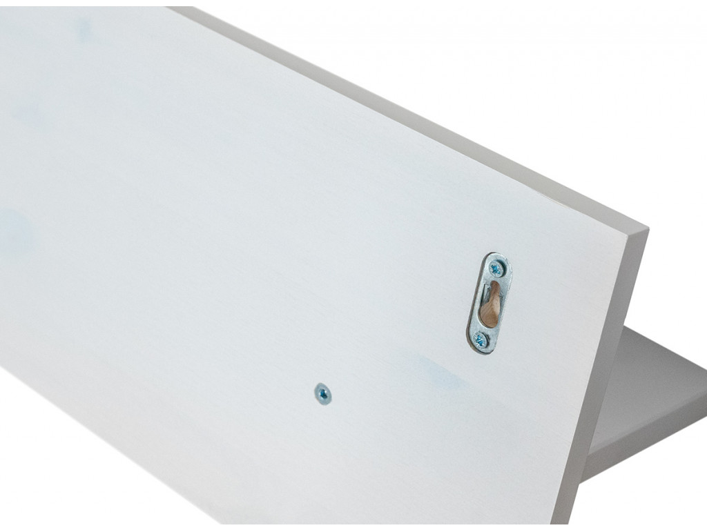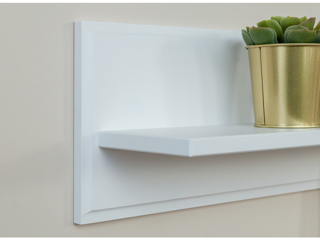 Polica má jednoduchý, minimalistický dizajn. Je vhodný do obývacích izieb alebo spální v rôznych štýloch. Vďaka škandinávskemu štýlu je v posledných rokoch veľmi obľúbený biely drevený nábytok. Biela polička vďaka svojej farbe a klasickej, nadčasovej elegancii dreva, bude skvelým akcentom aj v interiéroch zariadených v provensálskom, rustikálnom alebo vintage štýle. Je však taká univerzálny, že bude skvele vyzerať aj v modernejších úpravách.