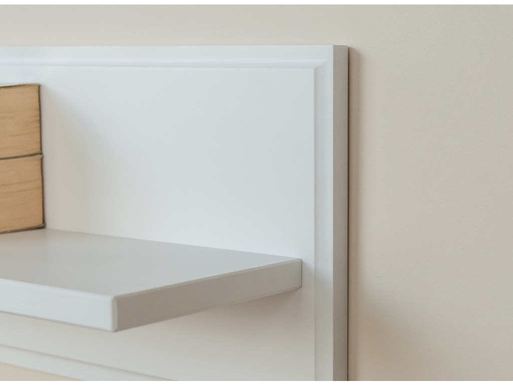 Všetky prvky police sú vyrobené z masívneho borovicového dreva. Drevo je natreté na bielo ekologickým náterom na vodnej báze s neúplným krytím. Pod vrstvou farby je viditeľná štruktúra dreva - uzly a kresba drevených krúžkov. Pripomína autentickosť dreva a zdôrazňuje jeho ušľachtilý charakter.