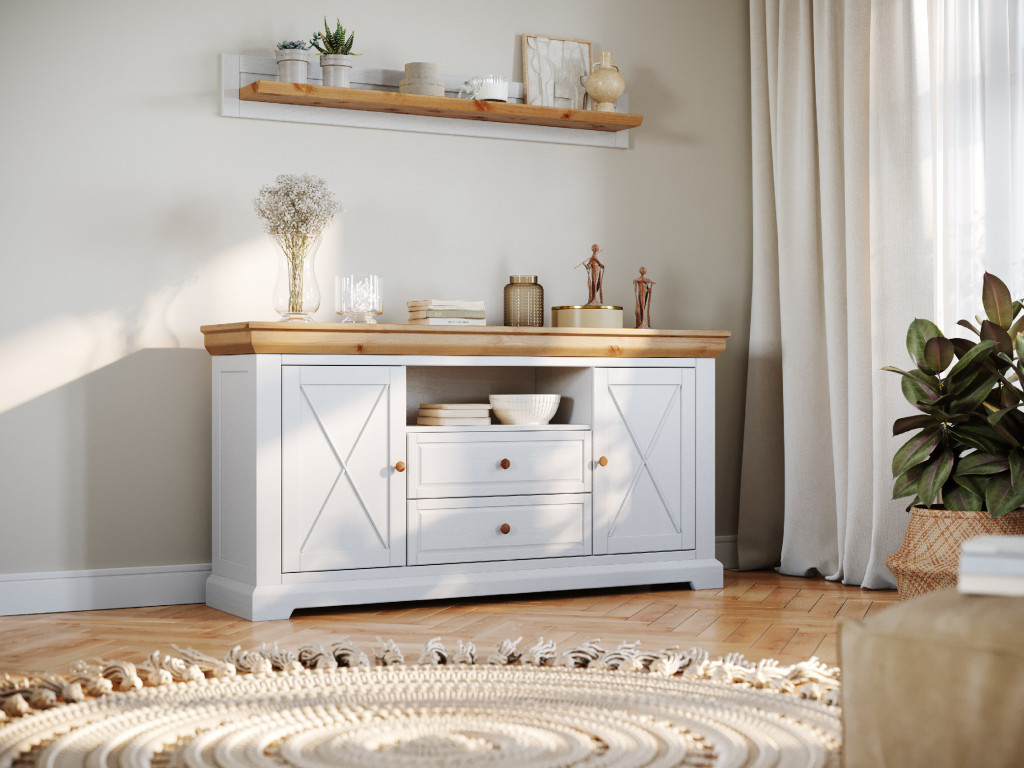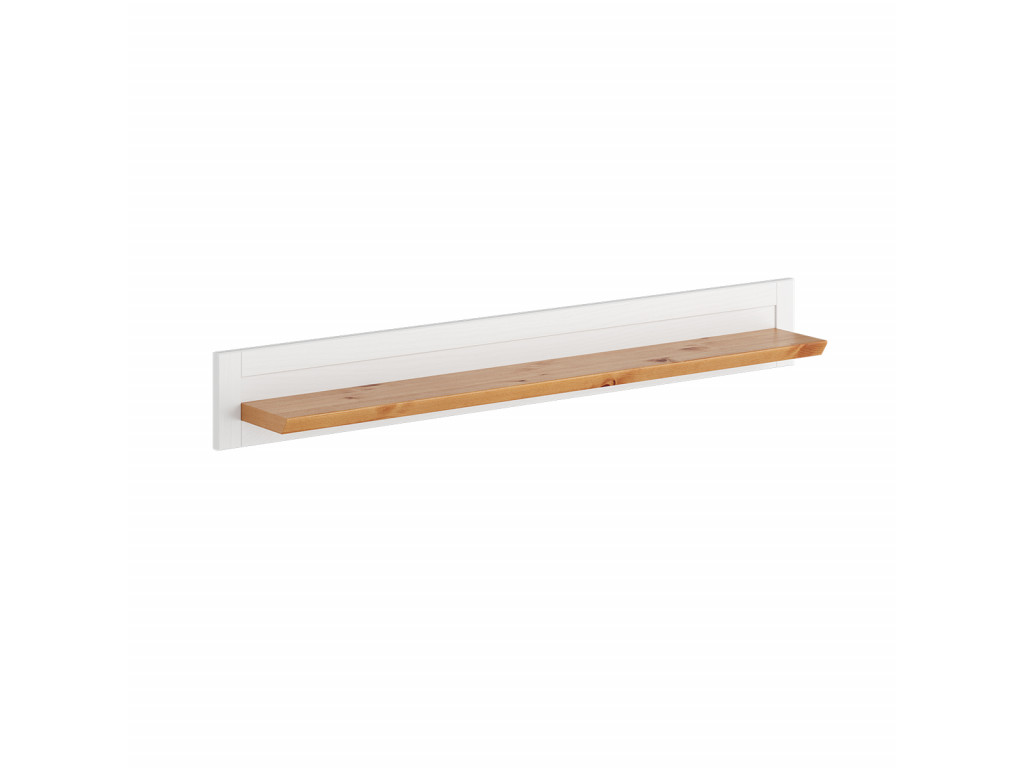 Polica je vyrobená z fínskeho borovicového dreva, ktoré je odolné voči poškodeniu. Zmestí sa na ňu všetko, čo na nej chcete vystaviť. Môžu to byť kvety, fotografie, či dekorácie. Polica na stenu je vyrobená v kombinácií farieb biela a prírodná borovica. Tá je natretá len moridlom a vodným lakom, preto na nej môžete pozorovať prirodzenú štruktúru dreva. Hodí sa ku nábytku v rôznom štýle.