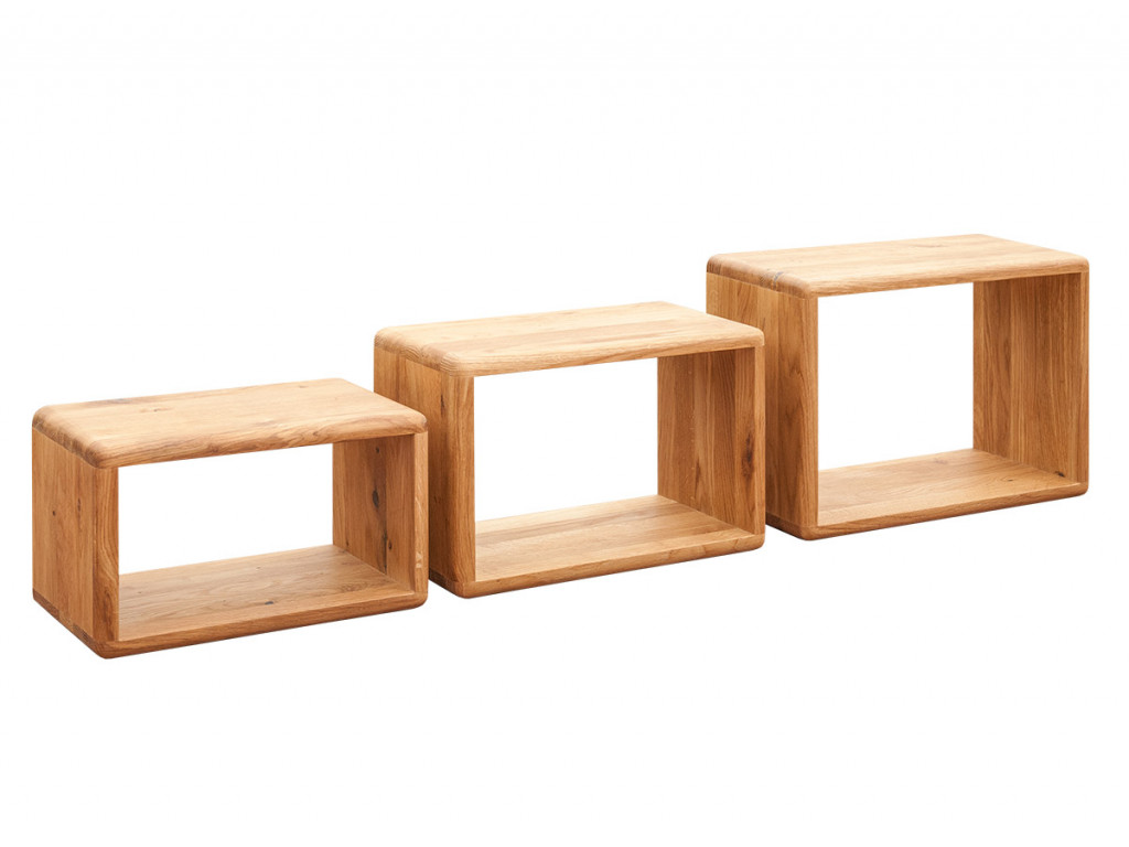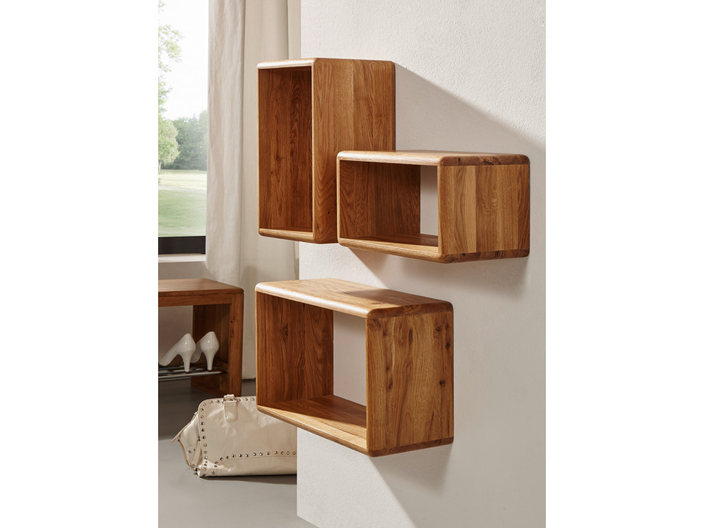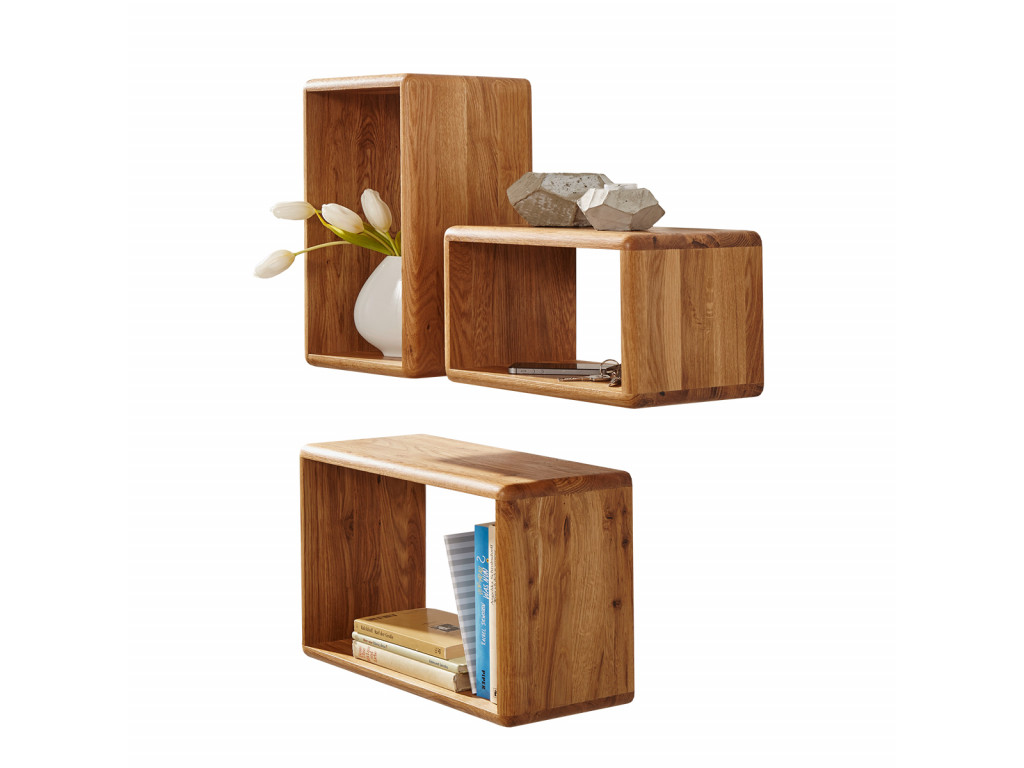 Oživte steny obývačky o 3 otvorené police v rôznych veľkostiach, ktoré si zavesíte podľa svojej chuti. Do poličiek môžete uložiť ozdobné dekorácie ako kvety, vázy ale aj praktické veci na uloženie. Masívne police sú vyrobené z kvalitného duba vo farbe dub, ktorá vydrží roky. Police v minimalistickom dizajne so zaoblenými hranami zavesíte do každej miestnosti v dome.