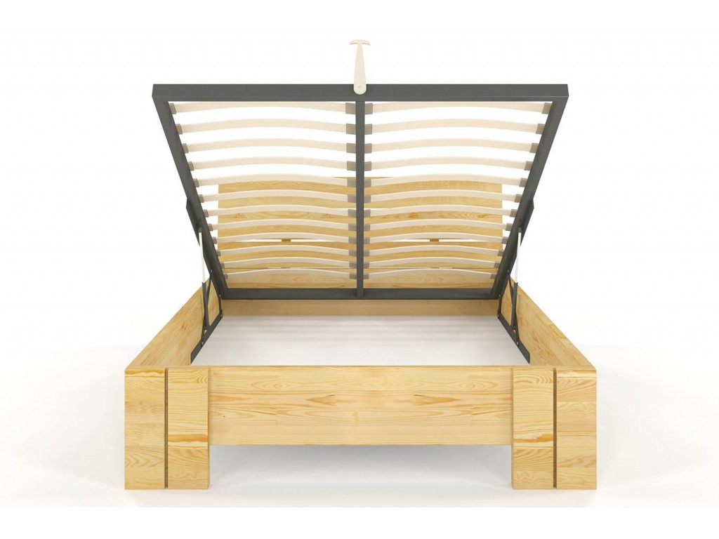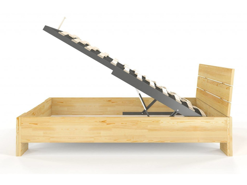 Drevená posteľ z masívnej borovice z kolekcie Arhus High vo vyššej verzii s dizajnovým trojdielnym čelom. Kvalitné spracovanie v tomto prípade ide ruka v ruke s praktickosťou - posteľ je vybavená šikovným úložným priestorom, do ktorého raz-dva odložíte nielen posteľnú bielizeň.