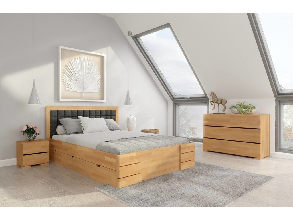 Buková posteľ Gotland High čalúnenie a zásuvky - orech