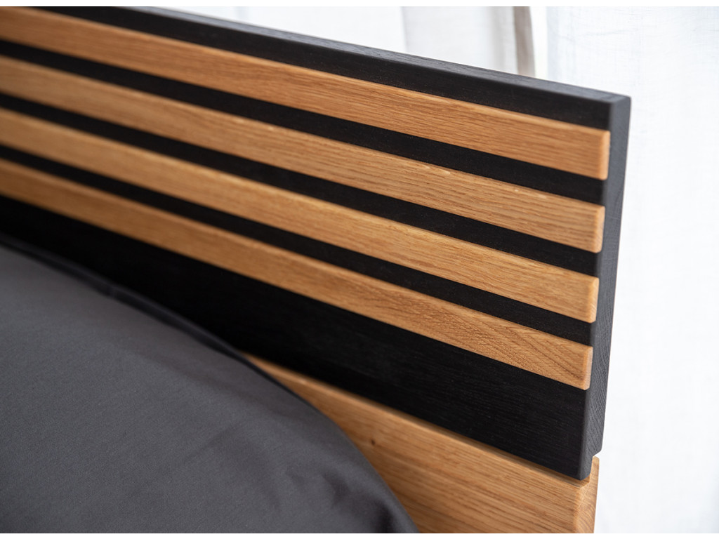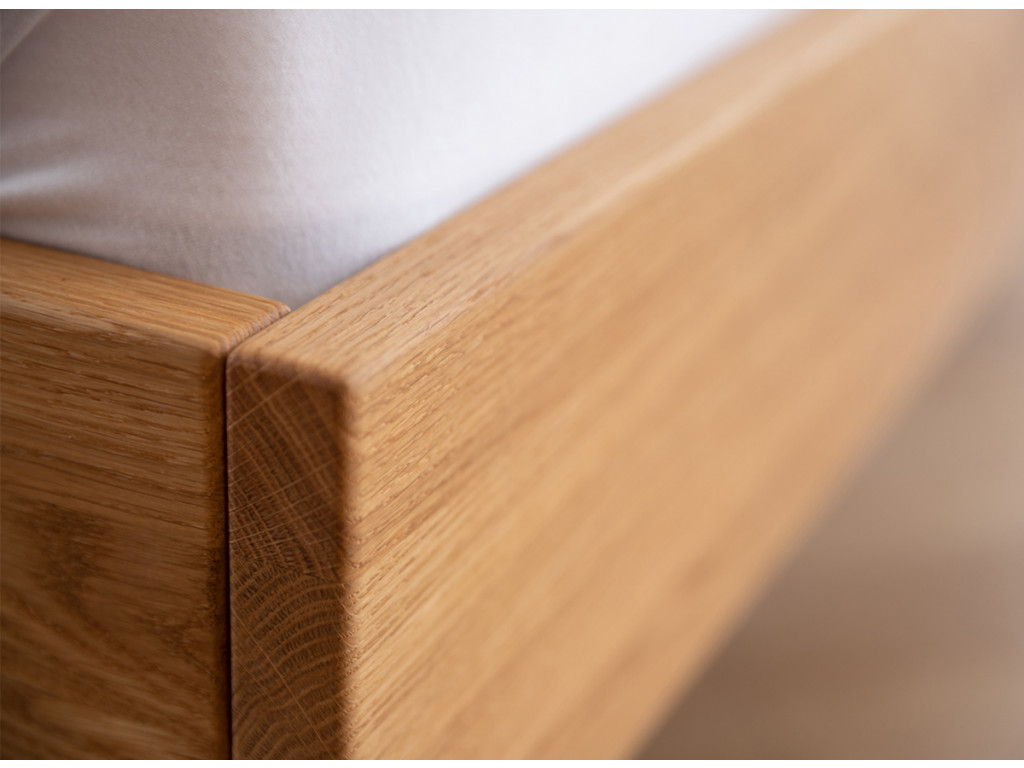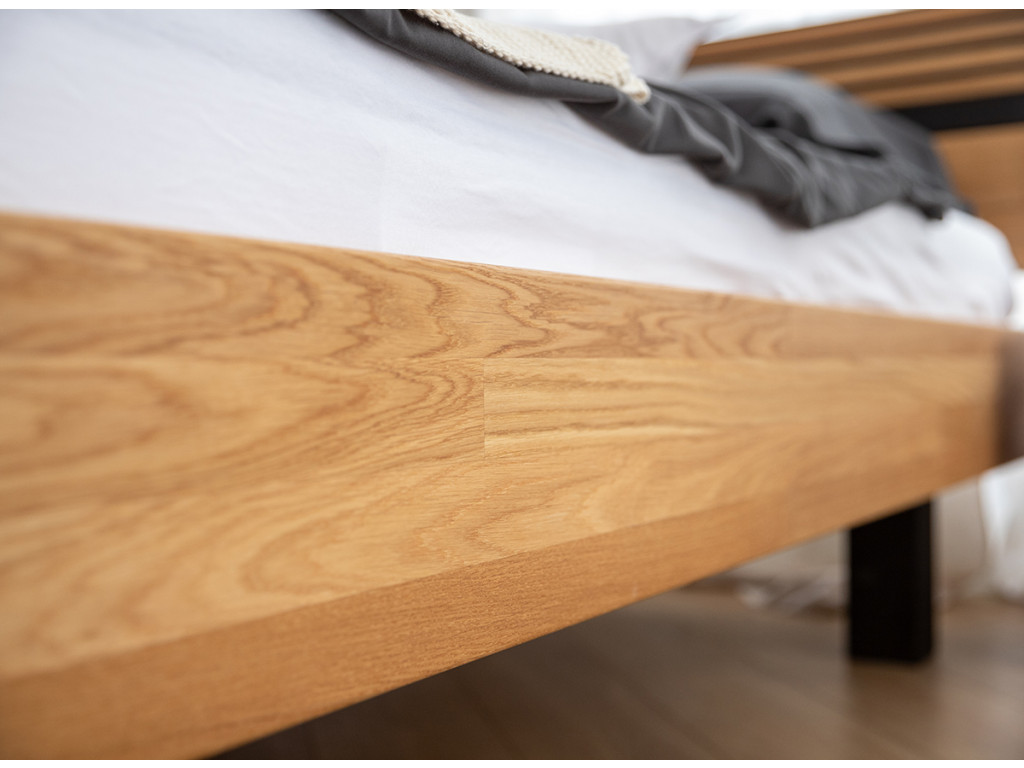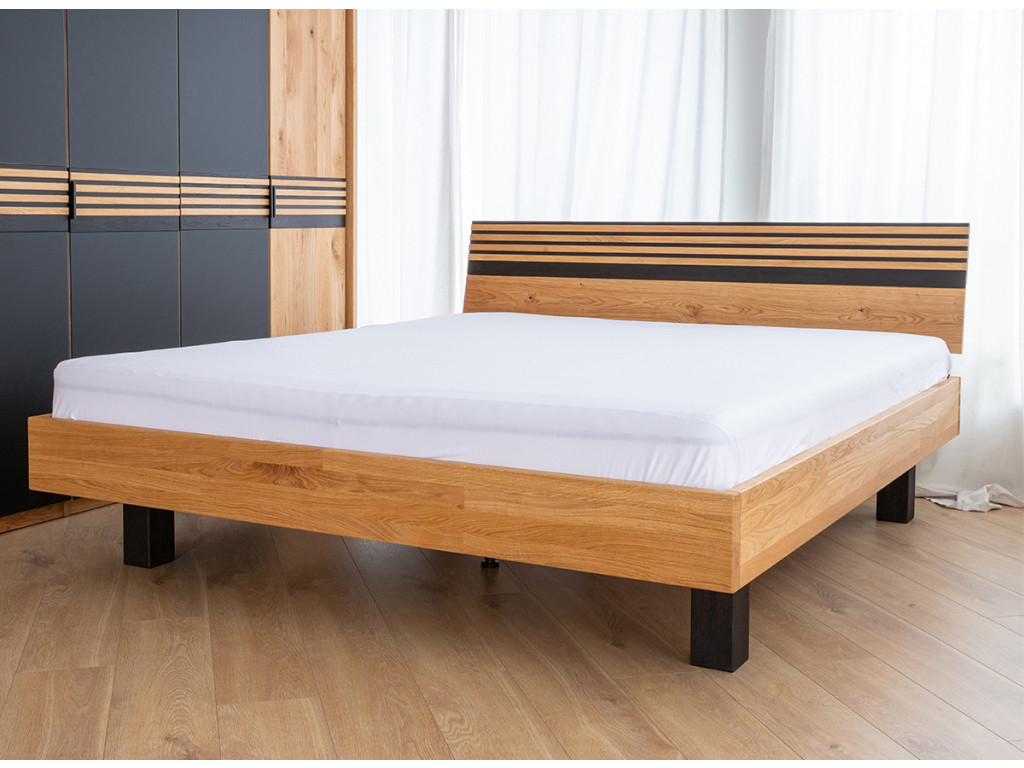 Vonkajší povrch bol upravený olejovaním, čo zaručuje dlhoročnú životnosť a minimalizuje riziko prílišného poškodenia, ak sa nábytok používa podľa určenia. Elegantný tvar manželskej postele sa vyznačuje zlatou farbou v teplých tónoch, ktorá je dokonale skombinovaná s čiernou v podobe úzkych pruhov prechádzajúcich cez šírku čela a masívnych nôh s rozmermi 9 x 9 cm, ktoré podporujú opticky odľahčený tvar postele. O pevnosť a trvácnosť sa tiež postará korpus postele, ktorý je vyrobený z masívnych dubových dosiek s hrúbkou až 3 cm.