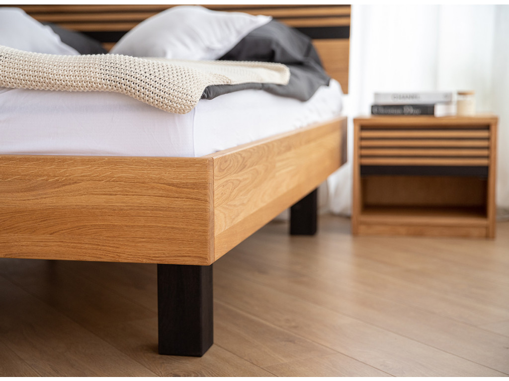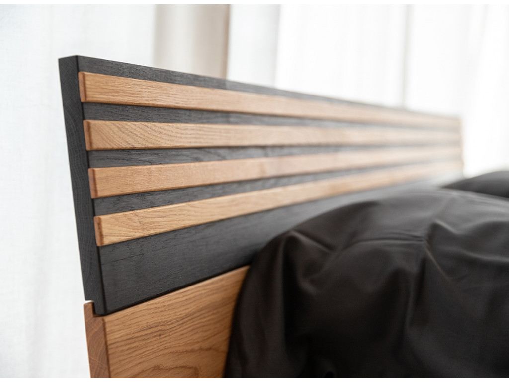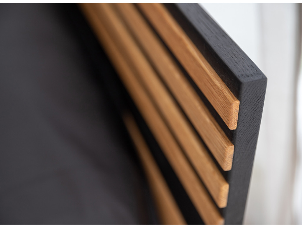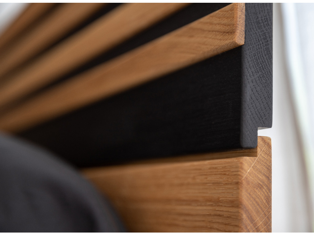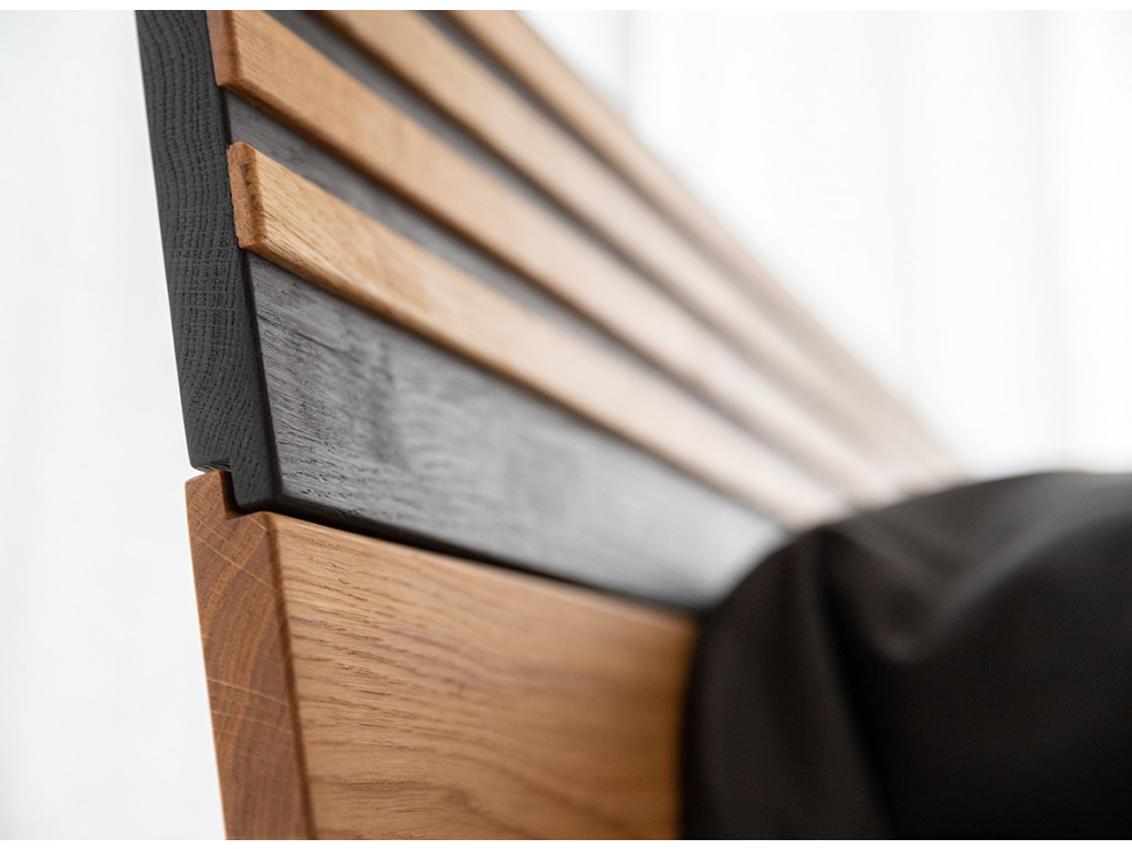 Vonkajší povrch bol upravený olejovaním, čo zaručuje dlhoročnú životnosť a minimalizuje riziko prílišného poškodenia, ak sa nábytok používa podľa určenia. Elegantný tvar manželskej postele sa vyznačuje zlatou farbou v teplých tónoch, ktorá je dokonale skombinovaná s čiernou v podobe úzkych pruhov prechádzajúcich cez šírku čela a masívnych nôh s rozmermi 9 x 9 cm, ktoré podporujú opticky odľahčený tvar postele. O pevnosť a trvácnosť sa tiež postará korpus postele, ktorý je vyrobený z masívnych dubových dosiek s hrúbkou až 3 cm.
