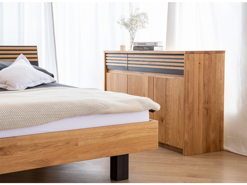 Dubová manželská posteľ Ravello určite osloví ľudí, ktorí majú radi moderný loftový štýl, ale aj štýl inšpirovaný art decom. Povrch postele je ošetrený prírodnými olejmi, ktoré nielen chránia drevo, ale aj zvýrazňujú jeho autentickú štruktúru a tón. Skvele sa kombinuje s ďalším dubovým nábytkom v rovnakom dizajne, pochádzajúcim z tejto kolekcie.