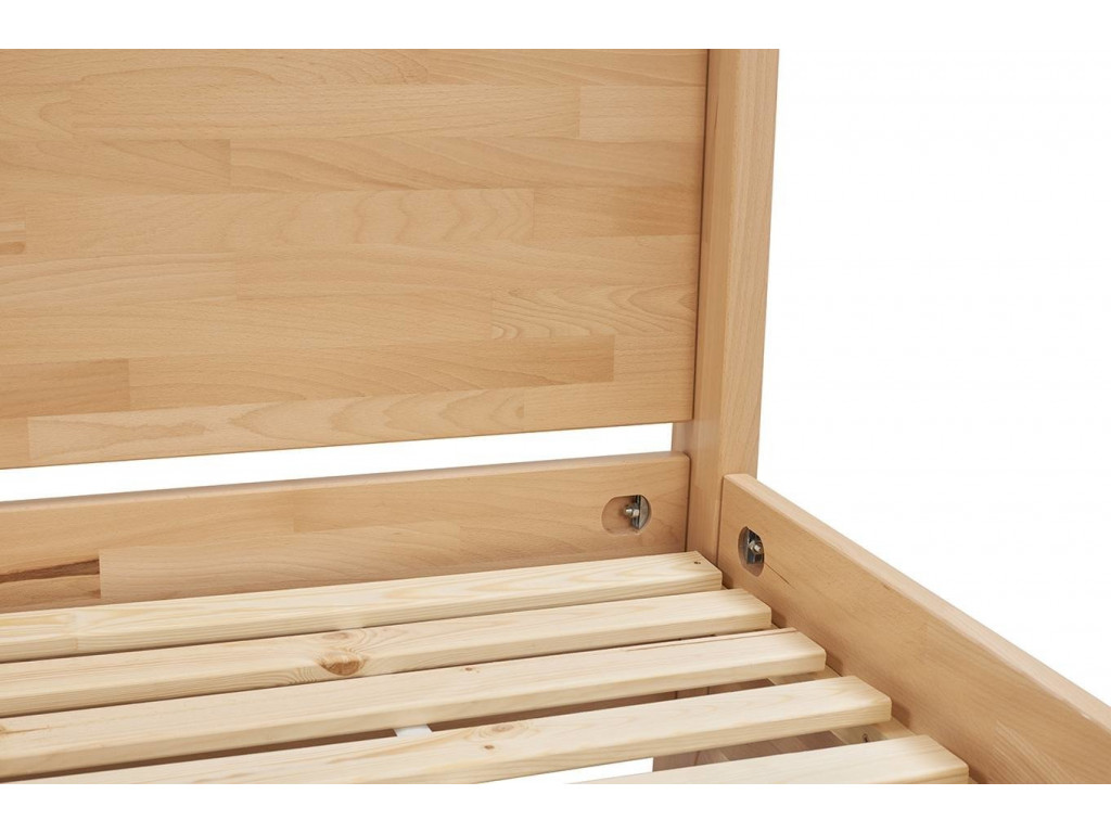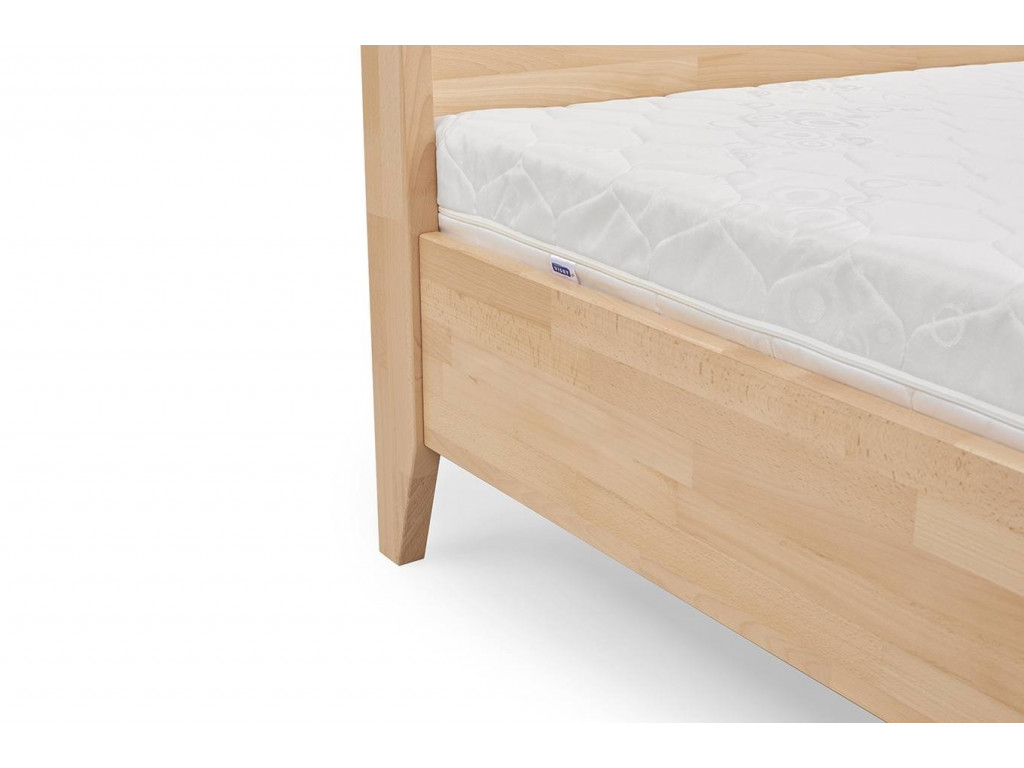 Posteľ s dreveným rámom má vysoké čelo postele, na ktoré si môžete pohodlne položiť dekoračný vankúš. Rozumne usporiadaná posteľ (matrac vo výške cca 40 cm) zaručuje pohodlné a ľahké vstávanie. Táto výška vás tiež chráni pred roztočmi a inými mikróbmi, ktoré žijú bližšie k podlahe. Posteľ ako taká stojí na 4 stabilných a hrubých nohách (4 x 10 cm), ktoré sú vysoké celkom 195 cm. Na vrchu sú spojené 4 pevnými priečnikmi s prierezom 4 x 4 cm.