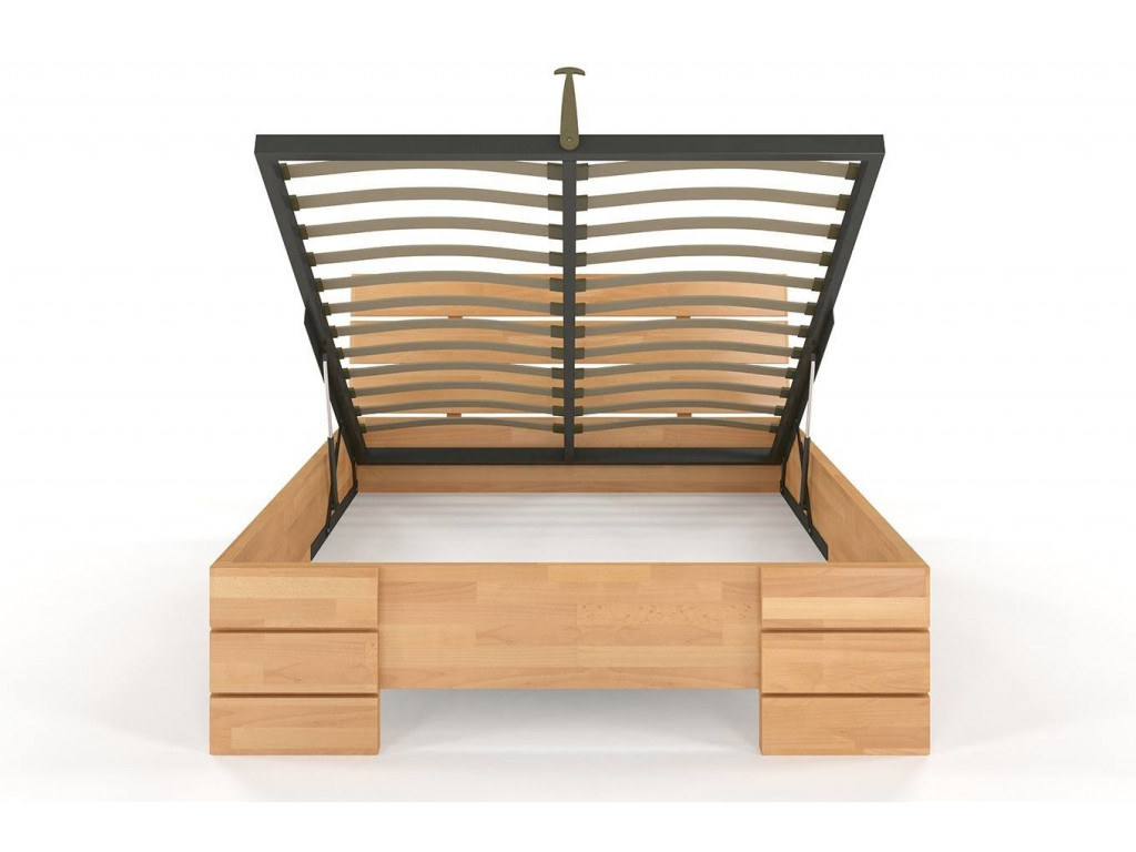 Masívna posteľ z bukového dreva vo vyššej verzii Sandemo High disponuje klasickým trojdielnym dreveným čelom. Trendový dizajn a detailné spracovanie v ničom nezaostávajú za jej praktickosťou, ktorá je korunovaná veľkorysým úložným priestorom.