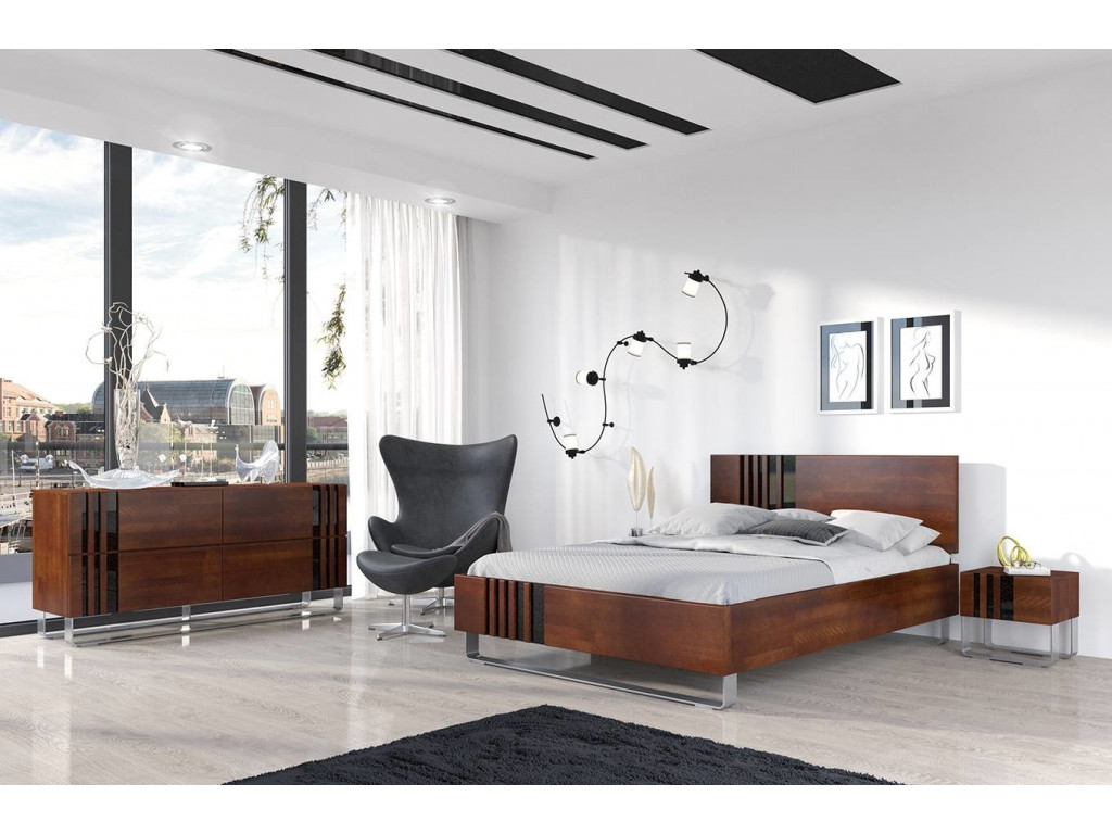 Drevená posteľ Kielce je plná harmónie a diskrétnej elegancie. Jej dizajn odkazuje na luxusný nábytok v štýle art deco. Jednoduchá forma je rafinovane kombinovaná so zaoblenými nohami a drevom s brúsenou oceľou. Motívy v podobe geometrických detailov na prednej strane postele z čierneho skla s prímesou nenápadných strieborných kovových pilín sú vlastnosti, vďaka ktorým je táto posteľ jedinečná. Celok dopĺňa praktické čelo, na ktorom vizuálne pokračuje čiarový vzor z rámu postele.