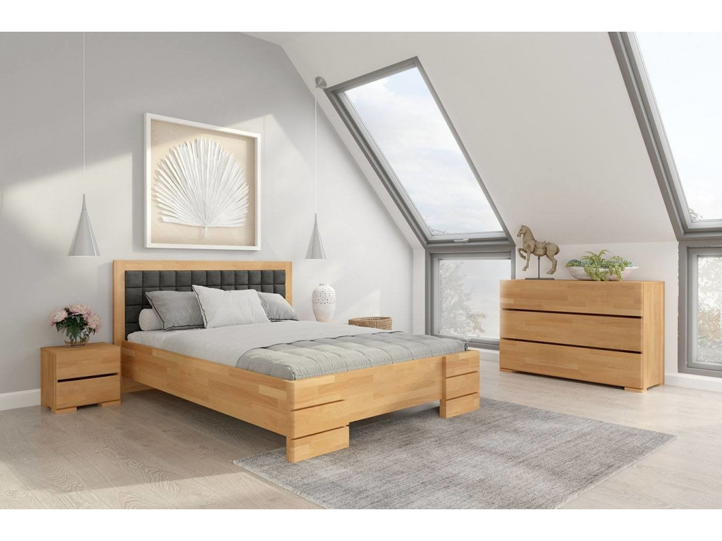 Vyššia verzia bukovej postele Gotland s čalúneným čelom, ktorá poskytne dokonalý odpočinok a vzhľad spálne. Nadštandardná poloha matraca uľahčuje vstávanie z postele. Hodí sa do priestranných interiérov. K dispozícii v 5 šírkach, 6 odtieňoch dreva a 18 farbách čalúnenia.