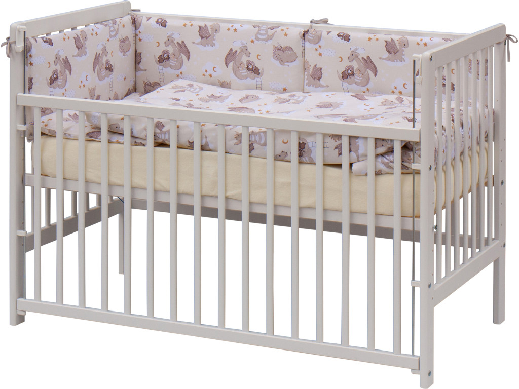 Detská postieľka z masívu (borovica) je klasického dizajnu a poslúži rodičom na dlhšie obdobie, pretože sa dá prispôsobiť rastu dieťaťa. Rošt postieľky sa dá nastaviť do šiestich polôh. Postupne ako dieťa rastie, rošt sa posúva smerom nadol. Postieľka má aj sťahovací bok . Zakúpením tejto postieľky je v cene aj kompletná súprava pre bábätko, ktorá obsahuje matrac, vankúš, perinku, plachtu a ochranný mantinel i obliečky béžovej farby s detským motívom dráčika.