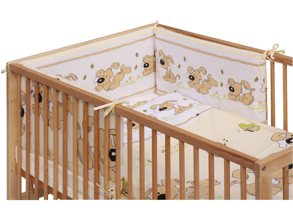 Detská postieľka Japy s kompletnou výbavou a béžovými lôžkovinami s detským motívom psíka prináša bezpečný a pohodlný priestor pre bábätko. Konštrukcia z bukového dreva v prírodnom odtieni, päť nastaviteľných polôh roštu a vyberacie priečky uľahčujú každodennú starostlivosť aj manipuláciu.