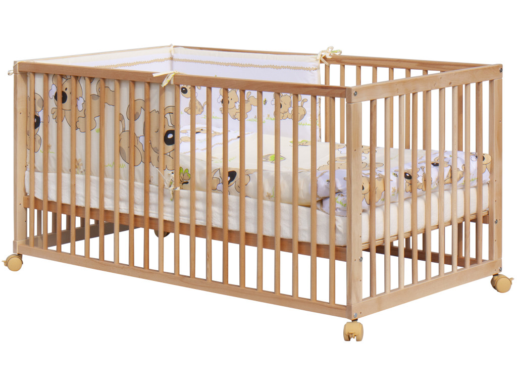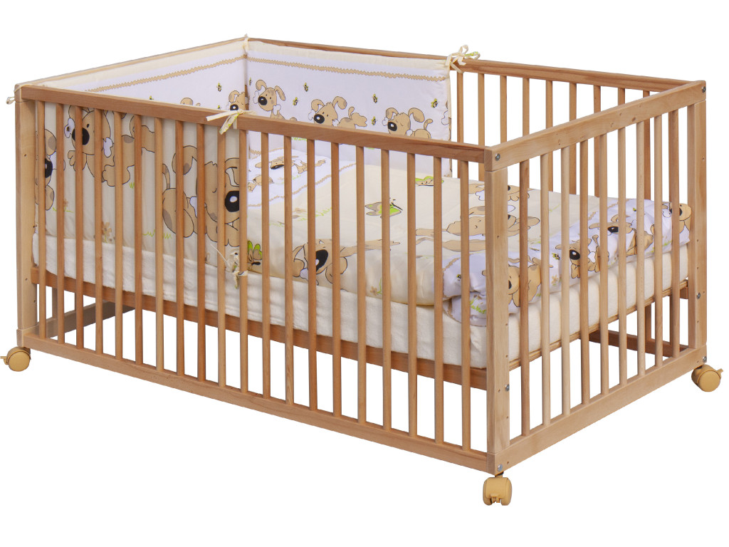 Detská postieľka z masívu (buk) je klasického dizajnu a poslúži rodičom na dlhšie obdobie, pretože sa dá prispôsobiť rastu dieťaťa. Rošt postieľky sa dá nastaviť do piatich polôh. Postupne ako dieťa rastie, rošt sa posúva smerom nadol. Postieľka má aj vyberateľné priečky a tak staršie dieťa môže po zobudení kedykoľvek vyjsť z postieľky samé. Zakúpením tejto postieľky je v cene aj kompletná súprava pre bábätko, ktorá obsahuje matrac, vankúš, perinku, plachtu a ochranný mantinel i obliečky béžovej farby s detským motívom psíka.
