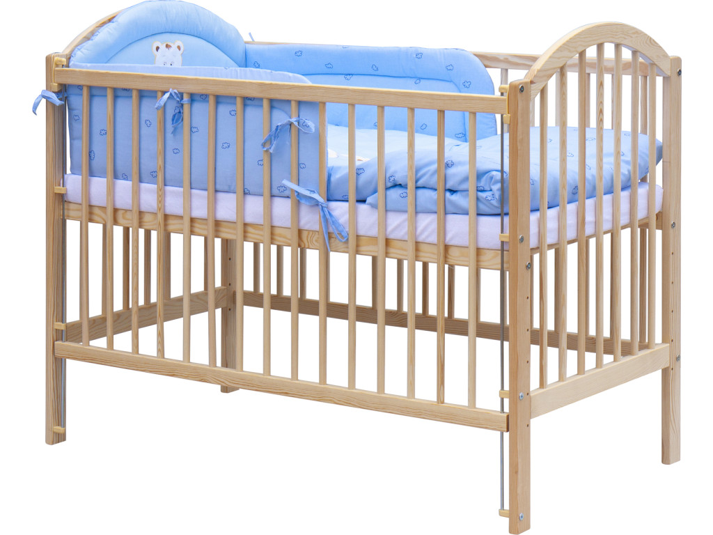 Detská postieľka z masívu (borovica) je klasického dizajnu a poslúži rodičom na dlhšie obdobie, pretože sa dá prispôsobiť rastu dieťaťa. Rošt postieľky sa dá nastaviť do šiestich polôh. Postupne ako dieťa rastie, rošt sa posúva smerom nadol. Postieľka má aj sťahovací bok. Zakúpením tejto postieľky je v cene aj kompletná súprava pre bábätko, ktorá obsahuje matrac, vankúš, perinku, plachtu a ochranný mantinel i obliečky modrej farby s detským motívom medvedíka.