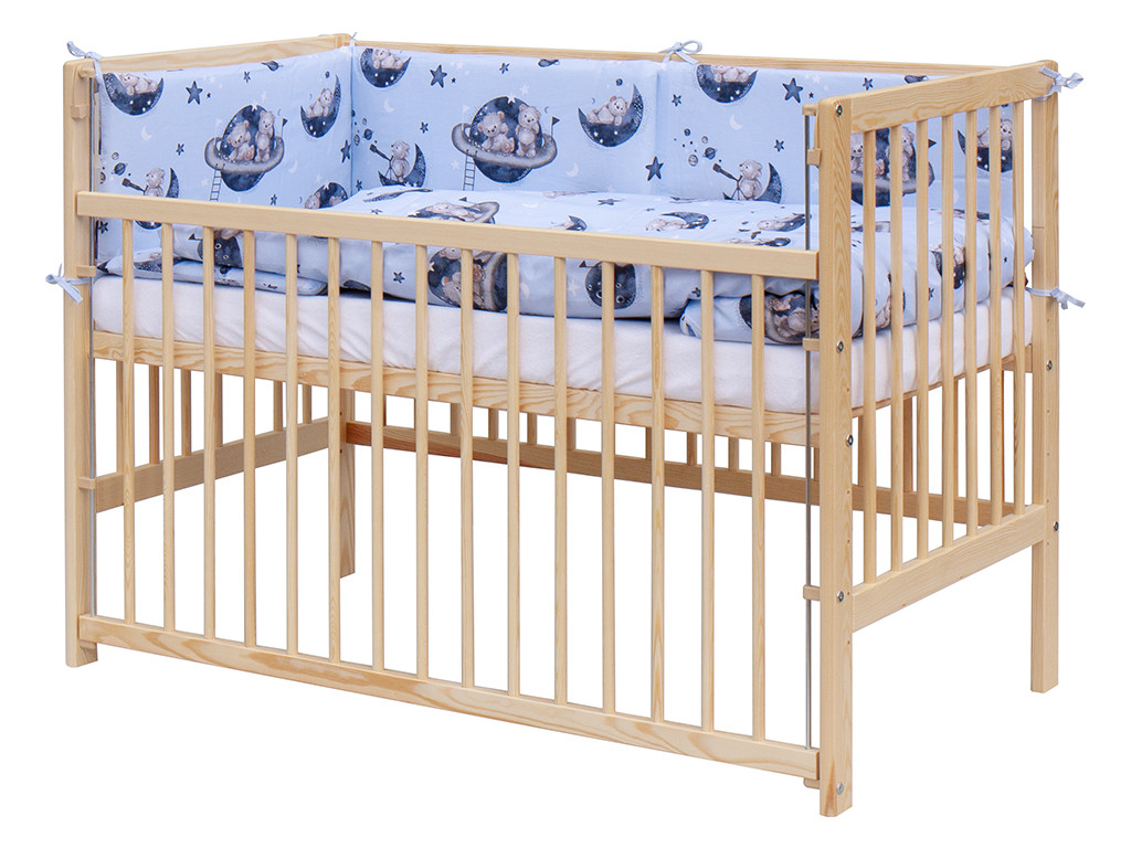 Detská postieľka z masívu (borovica) je klasického dizajnu a poslúži rodičom na dlhšie obdobie, pretože sa dá prispôsobiť rastu dieťaťa. Rošt postieľky sa dá nastaviť do šiestich polôh. Postupne ako dieťa rastie, rošt sa posúva smerom nadol. Postieľka má aj sťahovací bok. Zakúpením tejto postieľky je v cene aj kompletná súprava pre bábätko, ktorá obsahuje matrac, vankúš, perinku, plachtu a ochranný mantinel i obliečky modrej farby s detským motívom medvedíkov vo vesmíre.