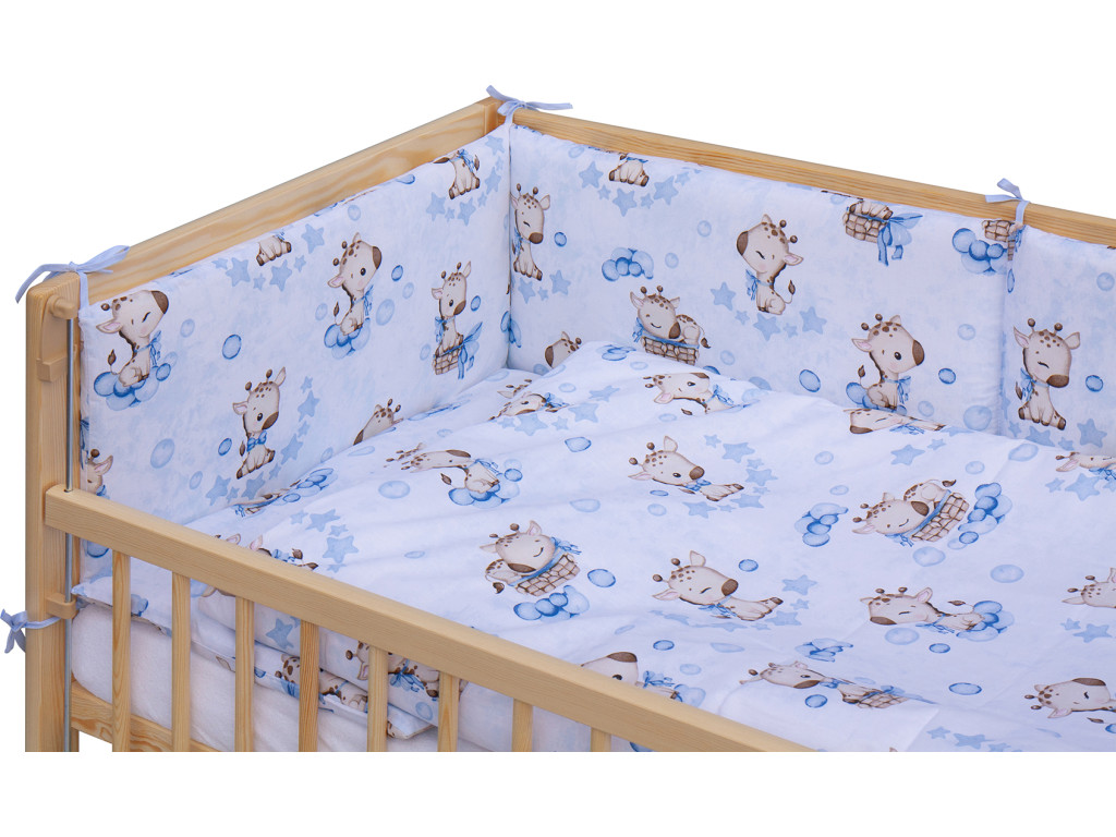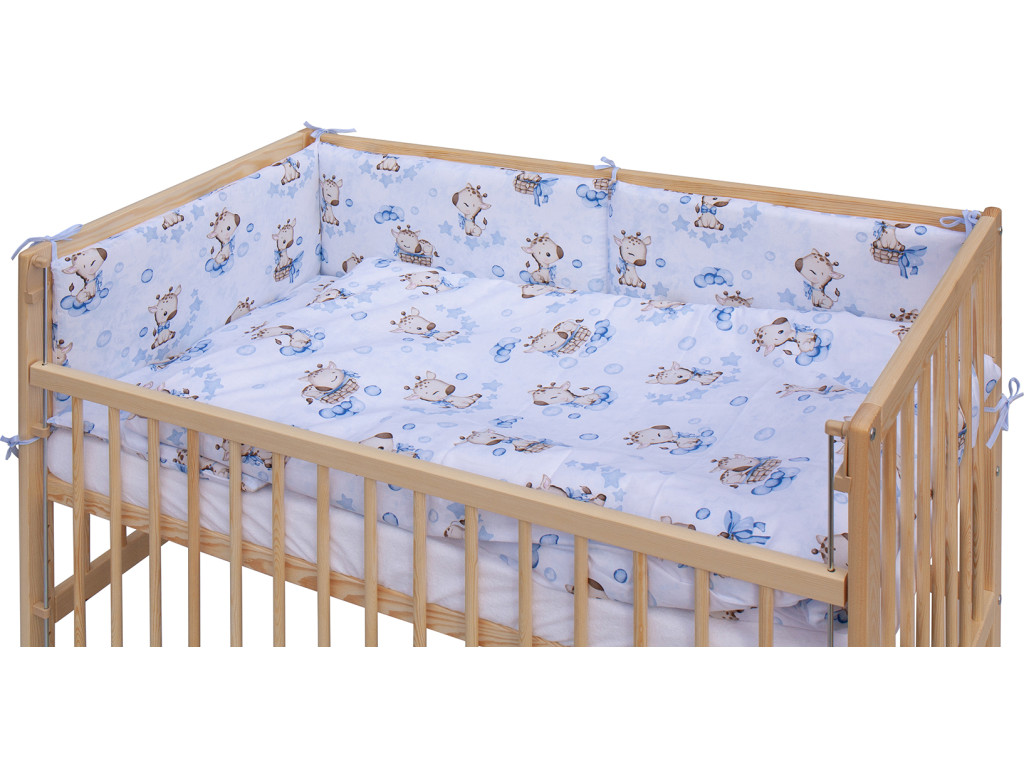 Detská postieľka z masívu (borovica) je klasického dizajnu a poslúži rodičom na dlhšie obdobie, pretože sa dá prispôsobiť rastu dieťaťa. Rošt postieľky sa dá nastaviť do šiestich polôh. Postupne ako dieťa rastie, rošt sa posúva smerom nadol. Postieľka má aj sťahovací bok. Zakúpením tejto postieľky je v cene aj kompletná súprava pre bábätko, ktorá obsahuje matrac, vankúš, perinku, plachtu a ochranný mantinel i obliečky modrej farby s detským motívom žirafky.