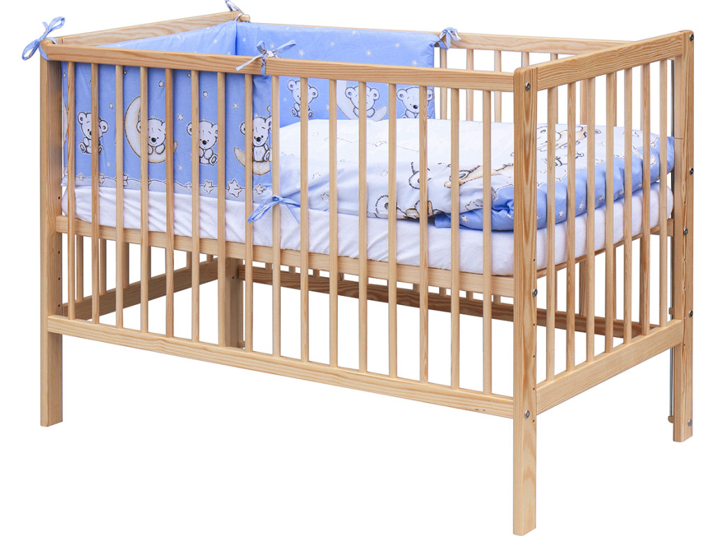 Detská postieľka z masívu (borovica) je klasického dizajnu a poslúži rodičom na dlhšie obdobie, pretože sa dá prispôsobiť rastu dieťaťa. Rošt postieľky sa dá nastaviť do šiestich polôh. Postupne ako dieťa rastie, rošt sa posúva smerom nadol. Postieľka má aj vyberateľné priečky a tak staršie dieťa môže po zobudení kedykoľvek vyjsť z postieľky samé. Zakúpením tejto postieľky je v cene aj kompletná súprava pre bábätko, ktorá obsahuje matrac, vankúš, perinku, plachtu a ochranný mantinel i obliečky modrej farby s detským motívom macka.