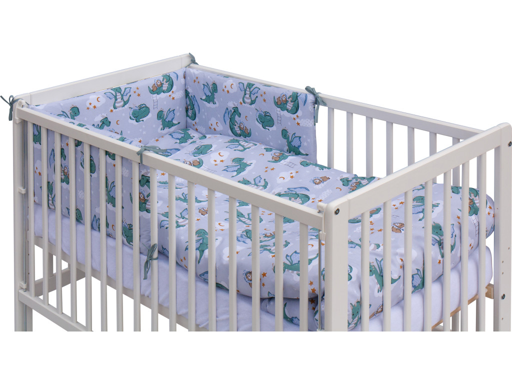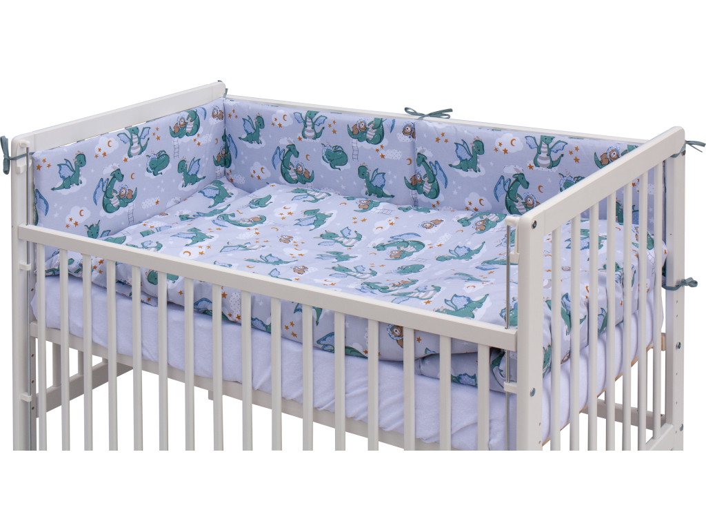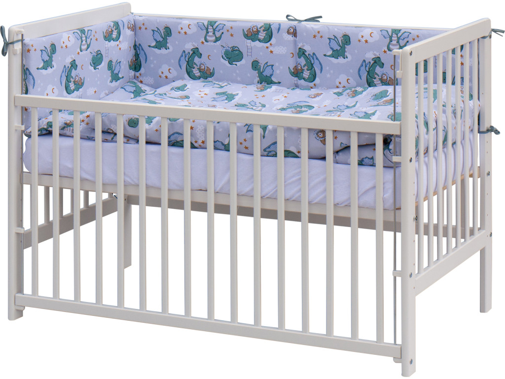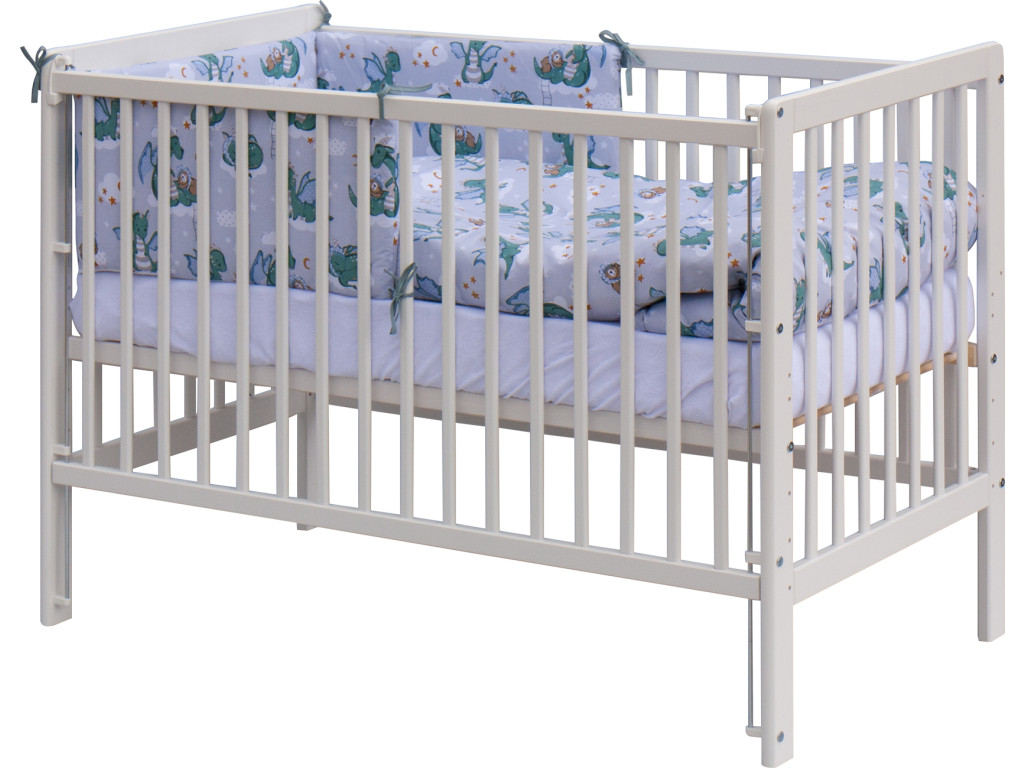 Detská postieľka z masívu (borovica) je klasického dizajnu a poslúži rodičom na dlhšie obdobie, pretože sa dá prispôsobiť rastu dieťaťa. Rošt postieľky sa dá nastaviť do šiestich polôh. Postupne ako dieťa rastie, rošt sa posúva smerom nadol. Postieľka má aj sťahovací bok . Zakúpením tejto postieľky je v cene aj kompletná súprava pre bábätko, ktorá obsahuje matrac, vankúš, perinku, plachtu a ochranný mantinel i obliečky tyrkysovej farby s detským motívom dráčika.