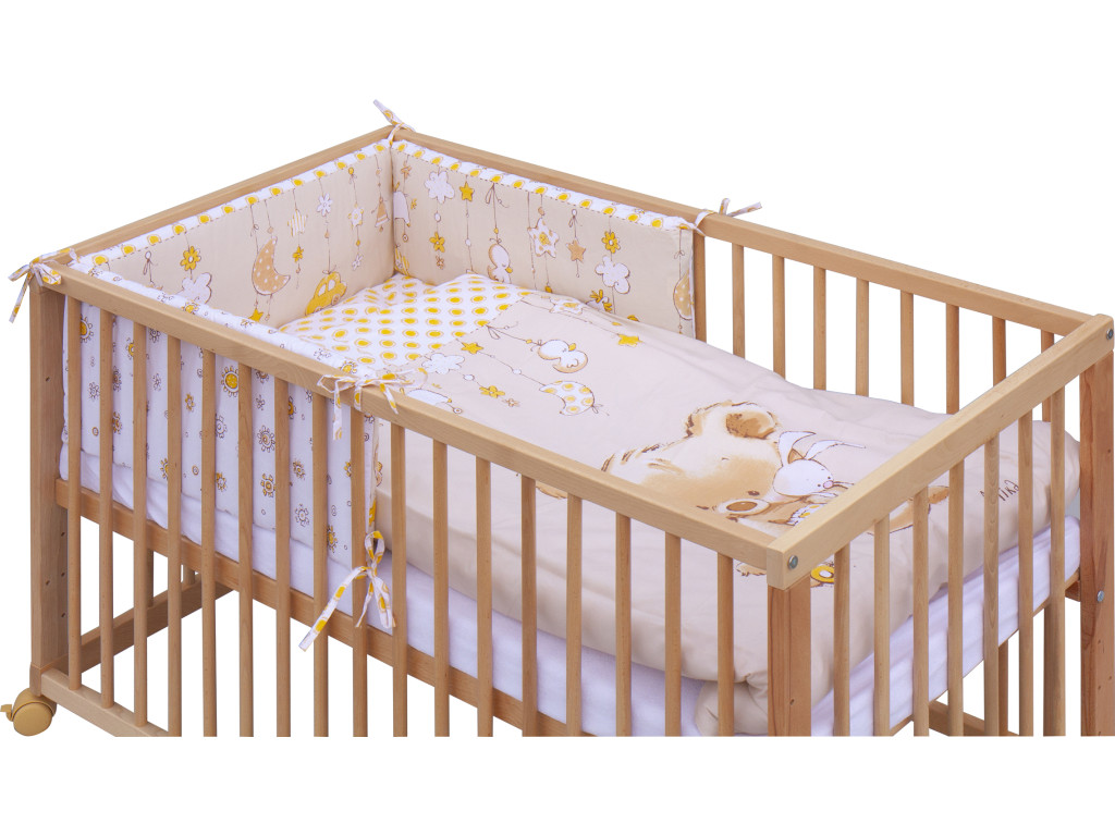 Detská postieľka z masívu (buk) je klasického dizajnu a poslúži rodičom na dlhšie obdobie, pretože sa dá prispôsobiť rastu dieťaťa. Rošt postieľky sa dá nastaviť do piatich polôh. Postupne ako dieťa rastie, rošt sa posúva smerom nadol. Postieľka má aj vyberateľné priečky a tak staršie dieťa môže po zobudení kedykoľvek vyjsť z postieľky samé. Zakúpením tejto postieľky je v cene aj kompletná súprava pre bábätko, ktorá obsahuje matrac, vankúš, perinku, plachtu a ochranný mantinel i obliečky béžovej farby s detským motívom macka.