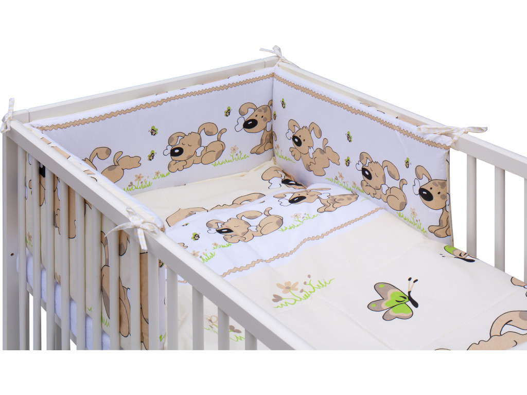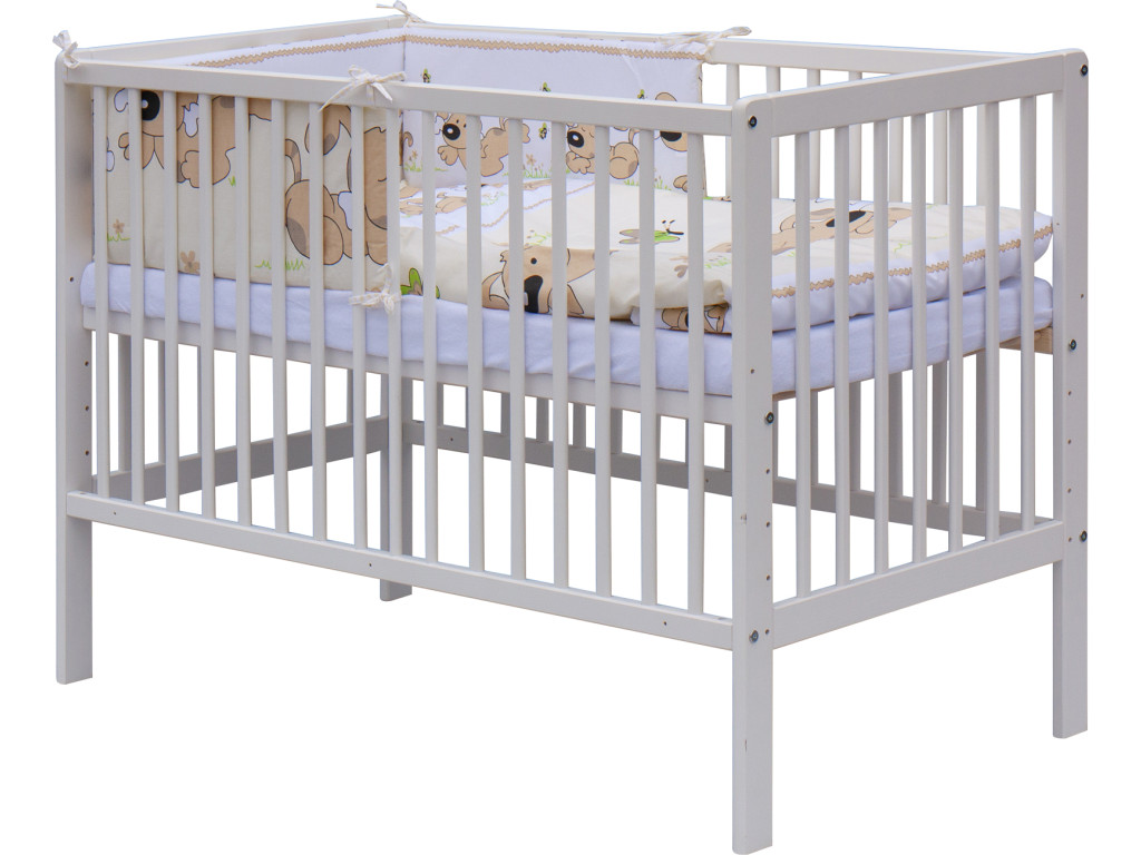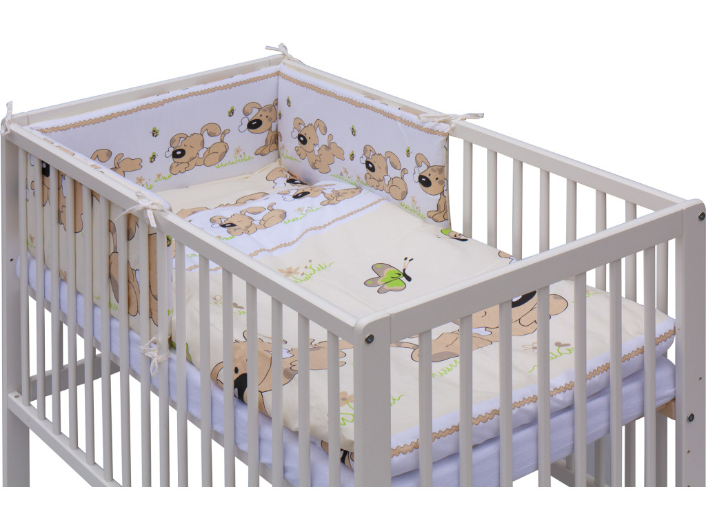 Detská postieľka z masívu (borovica) je klasického dizajnu a poslúži rodičom na dlhšie obdobie, pretože sa dá prispôsobiť rastu dieťaťa. Rošt postieľky sa dá nastaviť do piatich polôh. Postupne ako dieťa rastie, rošt sa posúva smerom nadol. Postieľka má aj vyberateľné priečky a tak staršie dieťa môže po zobudení kedykoľvek vyjsť z postieľky samé. Zakúpením tejto postieľky je v cene aj kompletná súprava pre bábätko, ktorá obsahuje matrac, vankúš, perinku, plachtu a ochranný mantinel i obliečky béžovej farby s detským motívom psíka.