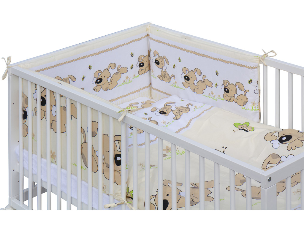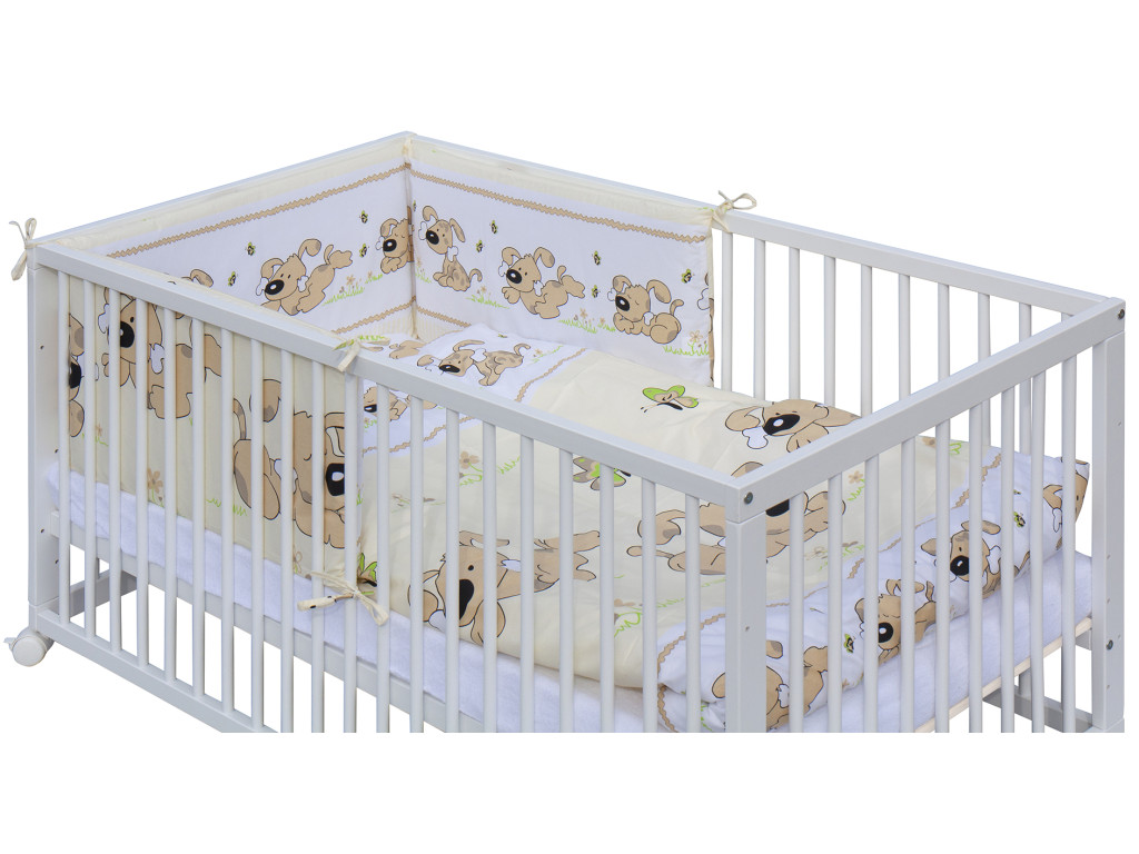 Postieľka Japy s kompletnou výbavou a béžovými lôžkovinami s detským motívom psíka prináša bezpečný a útulný spánok vášho dieťatka. Konštrukcia z bukového dreva v bielom vyhotovení, päť polôh roštu a vyberacie priečky zabezpečujú jednoduchú starostlivosť a maximálne pohodlie.