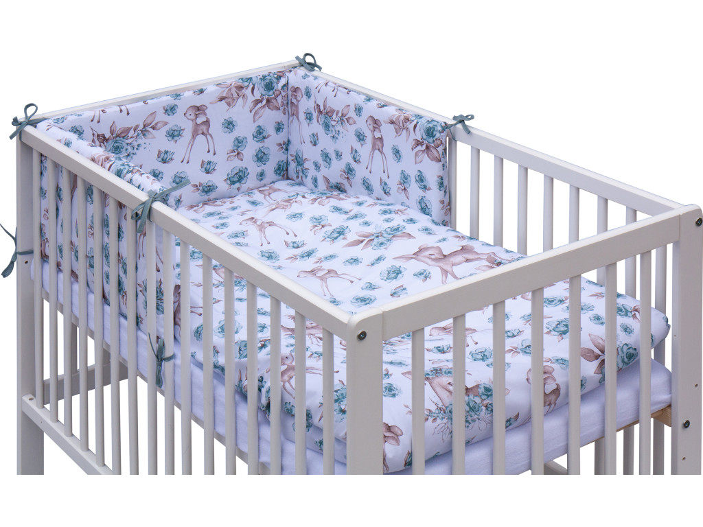 Vytvorte si oázu snov so postieľkou Srnček. Tyrkysové lôžkoviny s pôvabným motívom dodávajú izbe hravý nádych. Vyrobená z kvalitnej borovice a ladená do jemnej bielej farby, postieľka Srnček ponúka 5 polôh roštu a praktické vyberacie priečky, ktoré uľahčujú každodennú starostlivosť a prispôsobenie rastu dieťatka.