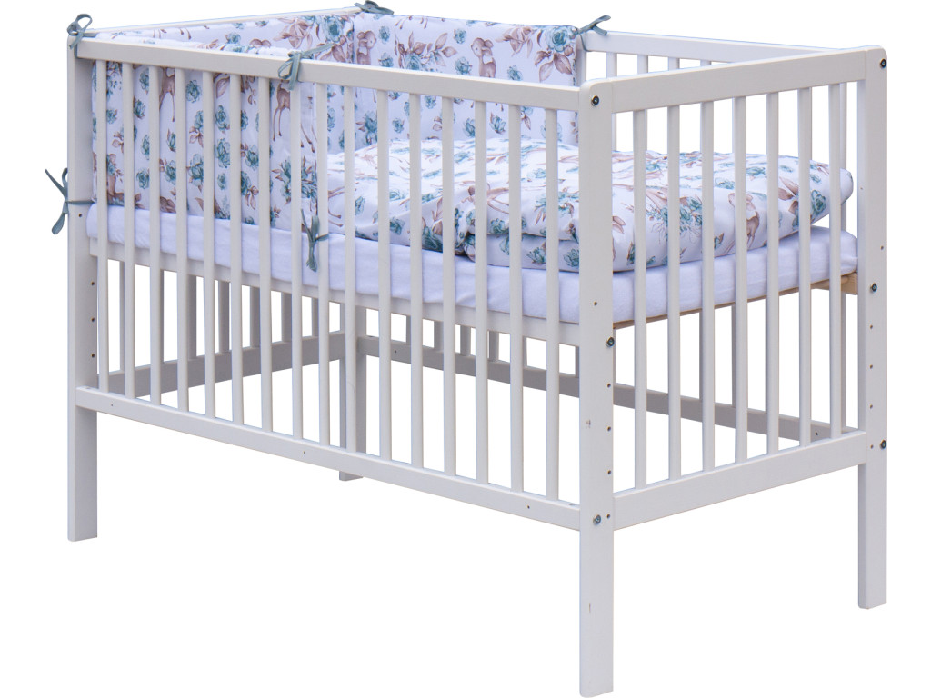Detská postieľka z masívu (borovica) je klasického dizajnu a poslúži rodičom na dlhšie obdobie, pretože sa dá prispôsobiť rastu dieťaťa. Rošt postieľky sa dá nastaviť do piatich polôh. Postupne ako dieťa rastie, rošt sa posúva smerom nadol. Postieľka má aj vyberateľné priečky a tak staršie dieťa môže po zobudení kedykoľvek vyjsť z postieľky samé. Zakúpením tejto postieľky je v cene aj kompletná súprava pre bábätko, ktorá obsahuje matrac, vankúš, perinku, plachtu a ochranný mantinel i obliečky tyrkysovej farby s detským motívom srnčeka.