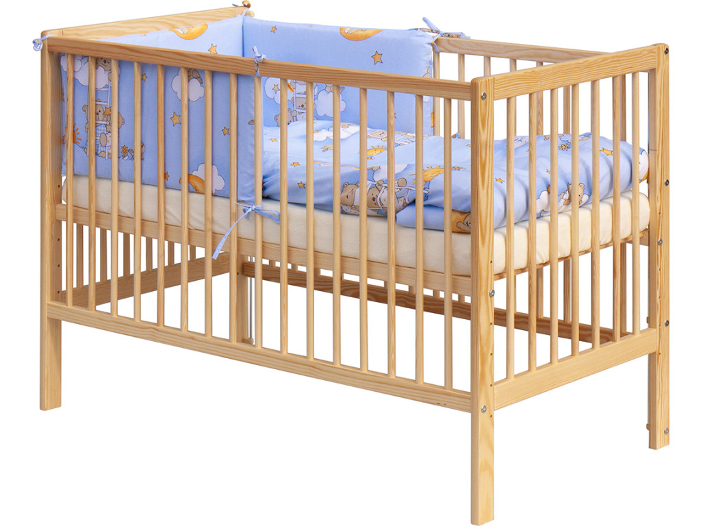 Detská postieľka z masívu (borovica) je klasického dizajnu a poslúži rodičom na dlhšie obdobie, pretože sa dá prispôsobiť rastu dieťaťa. Rošt postieľky sa dá nastaviť do šiestich polôh. Postupne ako dieťa rastie, rošt sa posúva smerom nadol. Postieľka má aj vyberateľné priečky a tak staršie dieťa môže po zobudení kedykoľvek vyjsť z postieľky samé. Zakúpením tejto postieľky je v cene aj kompletná súprava pre bábätko, ktorá obsahuje matrac, vankúš, perinku, plachtu a ochranný mantinel i obliečky modrej farby s detským motívom macíkov v oblakoch.