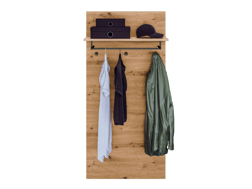 Vešiakový panel Nelin 15 ponúka poličku, vešiakovú tyč a tri vešiaky pre praktické uloženie kabátov, tašiek či doplnkov. Ideálny doplnok na udržanie poriadku vo vašej predsieni. Kombinuje štýl a funkčnosť pre moderný vstupný priestor.