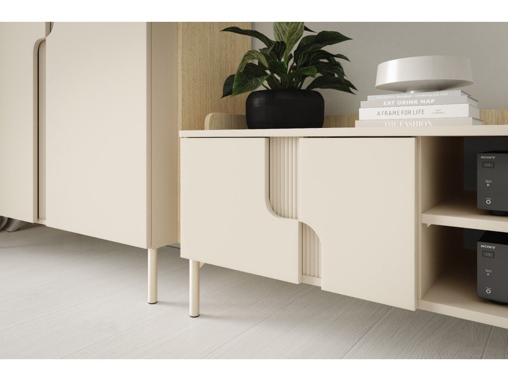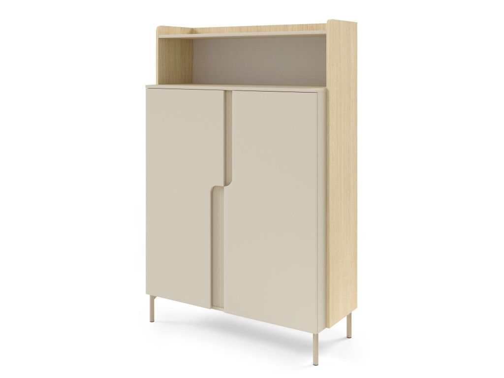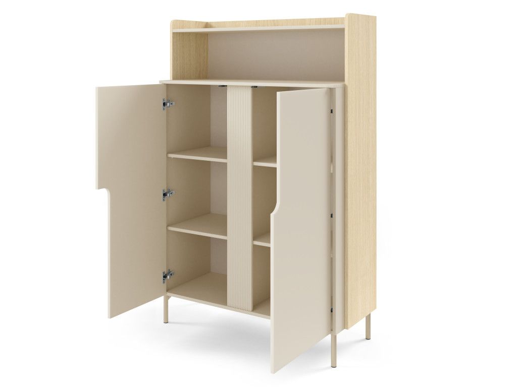 Dvojdverový regál Positano PO4 v kombinácii dub mavelie / macadamia pôsobí jemne a elegantne. Svetlé tóny dreva a krémovej farby vytvárajú harmonický a nadčasový vzhľad. Zaujímavým prvkom je otvorená horná polica, ktorá odľahčuje celkový dizajn. Dvierka s dekoratívnou lištou dodávajú nábytku jemný dizajnový detail. Bezúchytkové otváranie zabezpečuje pohodlie a zachováva minimalistický štýl.