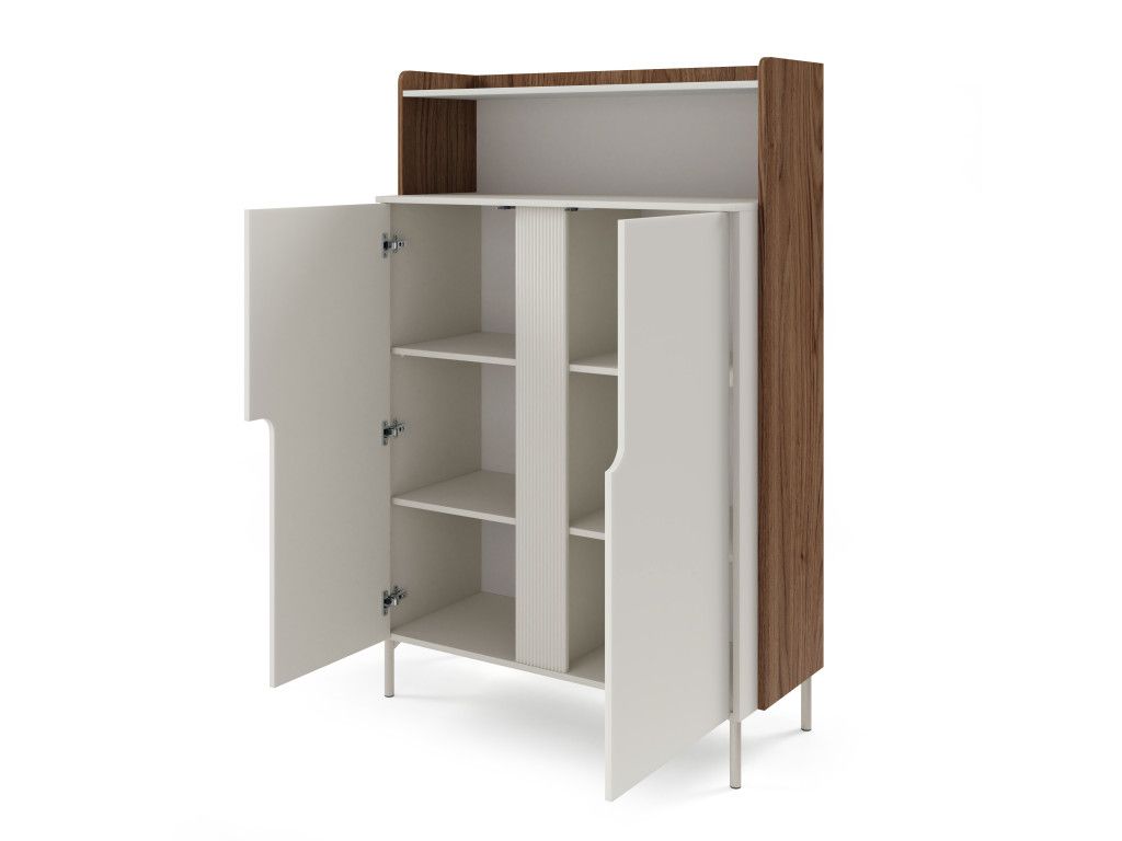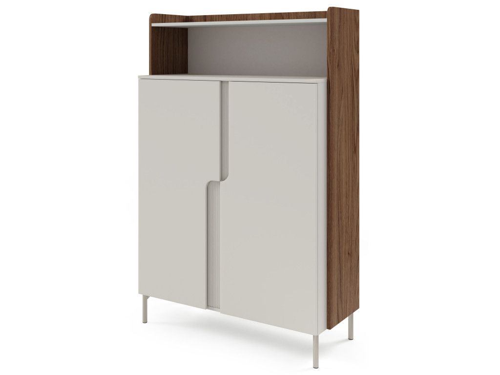 Dvojdverový regál Positano PO4 v prevedení orech alba / kašmírová béžová spája výrazný dizajn s praktickým využitím. Kontrast tmavšieho dreva a svetlej béžovej vytvára moderný a vizuálne zaujímavý prvok interiéru. Typické sú tvarované dvierka s vrúbkovanou lištou, ktoré dodávajú nábytku charakter. Otvorená polica v hornej časti prináša priestor na dekorácie či knihy. Minimalistické push to open (Tip-On) riešenie zachováva čistý vzhľad bez úchytiek.