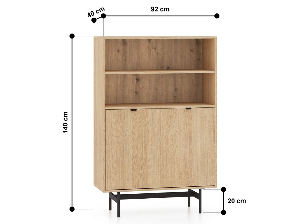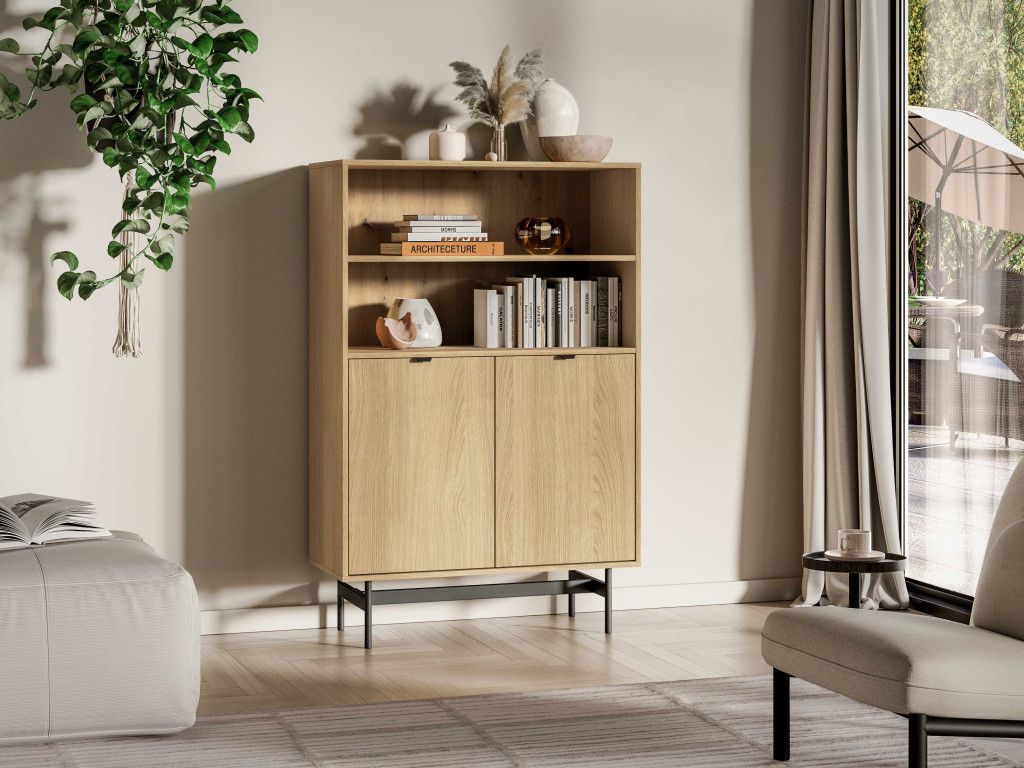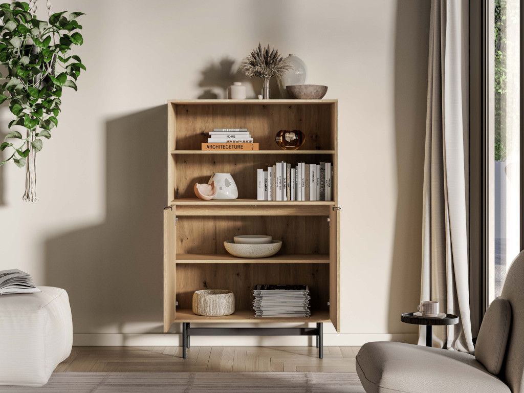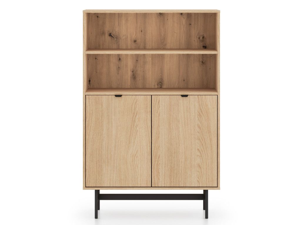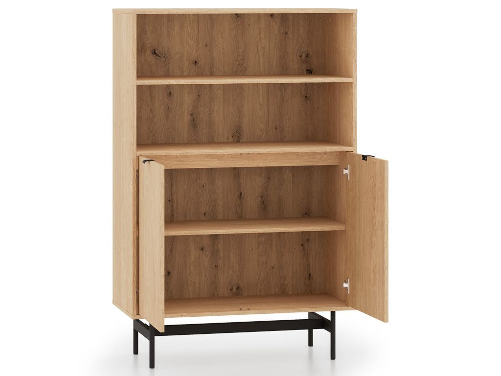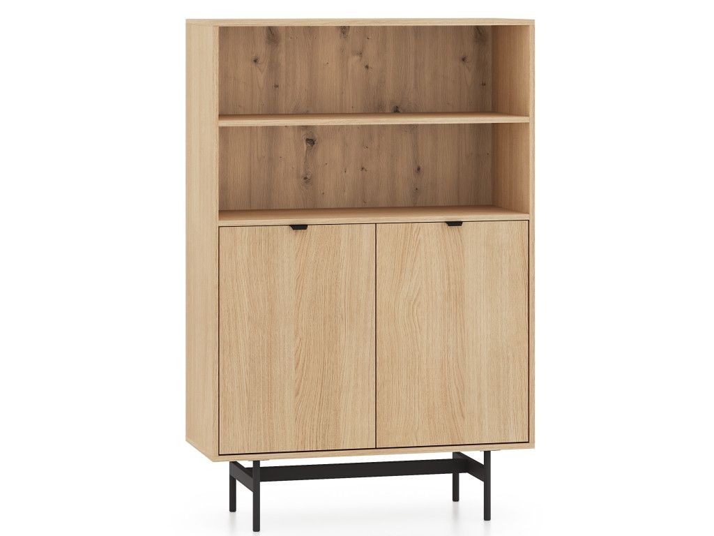 Dvojdverový regál Reynos 03 v dekore dub mavelie ponúka ideálnu kombináciu otvoreného a uzavretého úložného priestoru. Otvorené police sú vhodné na knihy či dekorácie, zatiaľ čo spodná skrinka pomáha udržať poriadok. Kontrast dreva a čiernej kovovej podnože dodáva nábytku moderný charakter. Minimalistické hranové úchytky a tiché dovieranie dverí zvyšujú komfort pri používaní.